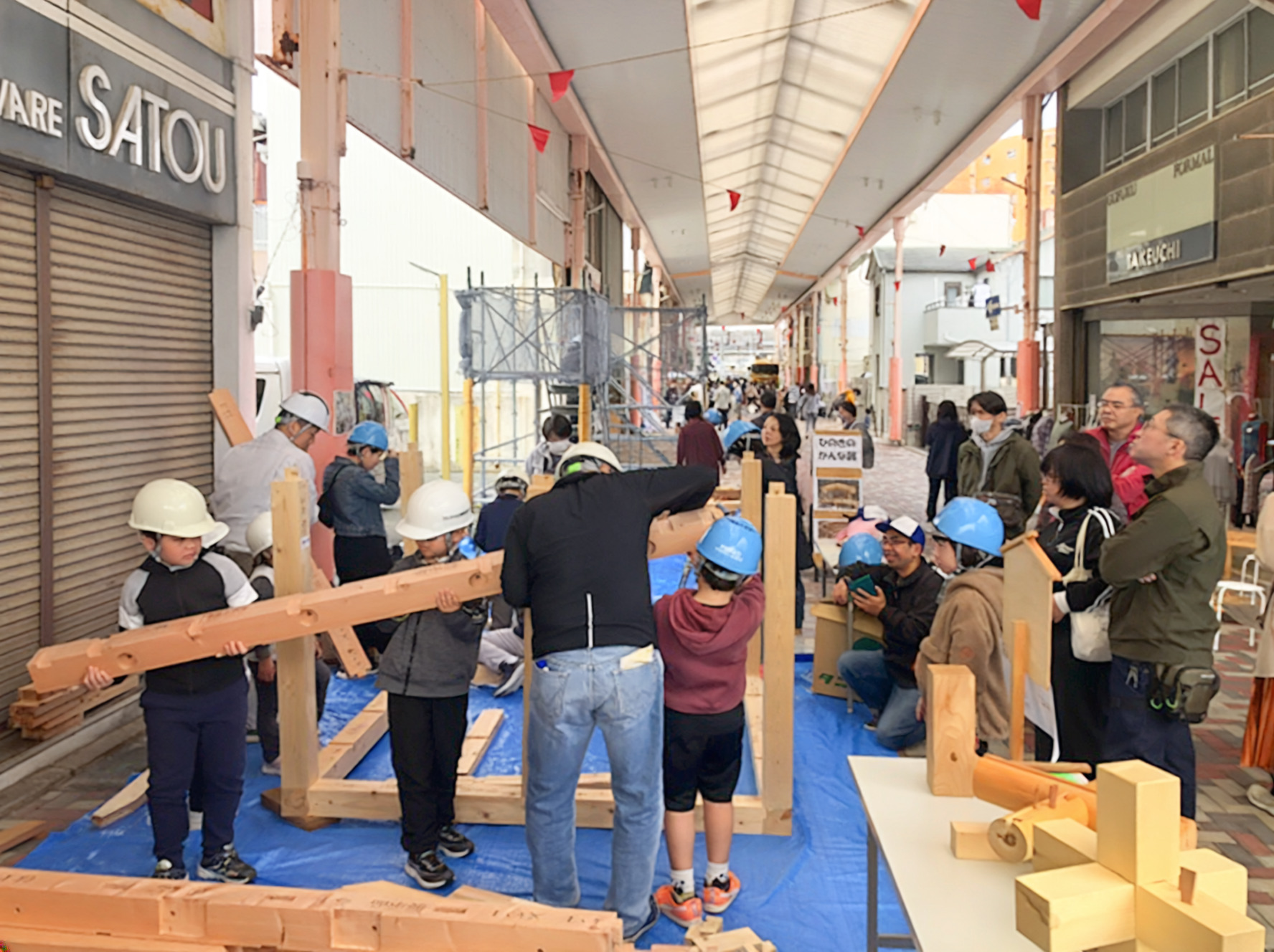 商店街の協力のもと通りを貸し切って、子供たちに建築のお仕事体験をしてもらう催しで、少子高齢化が進む中、未来を担う子供たちに建築の魅力を伝えることが目的です。