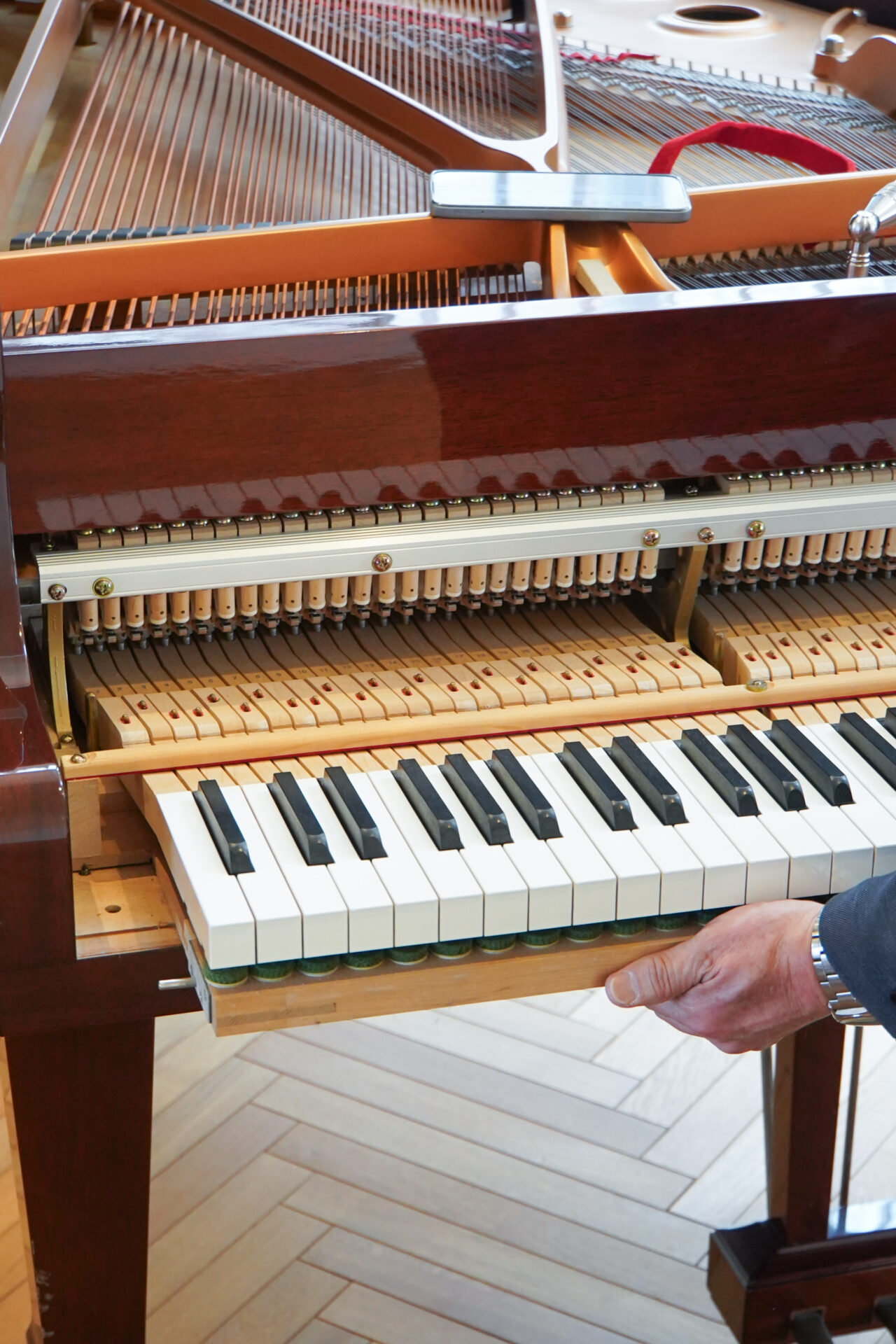 手際よくピアノのパーツを分解しながら、力強く鍵盤を叩き、