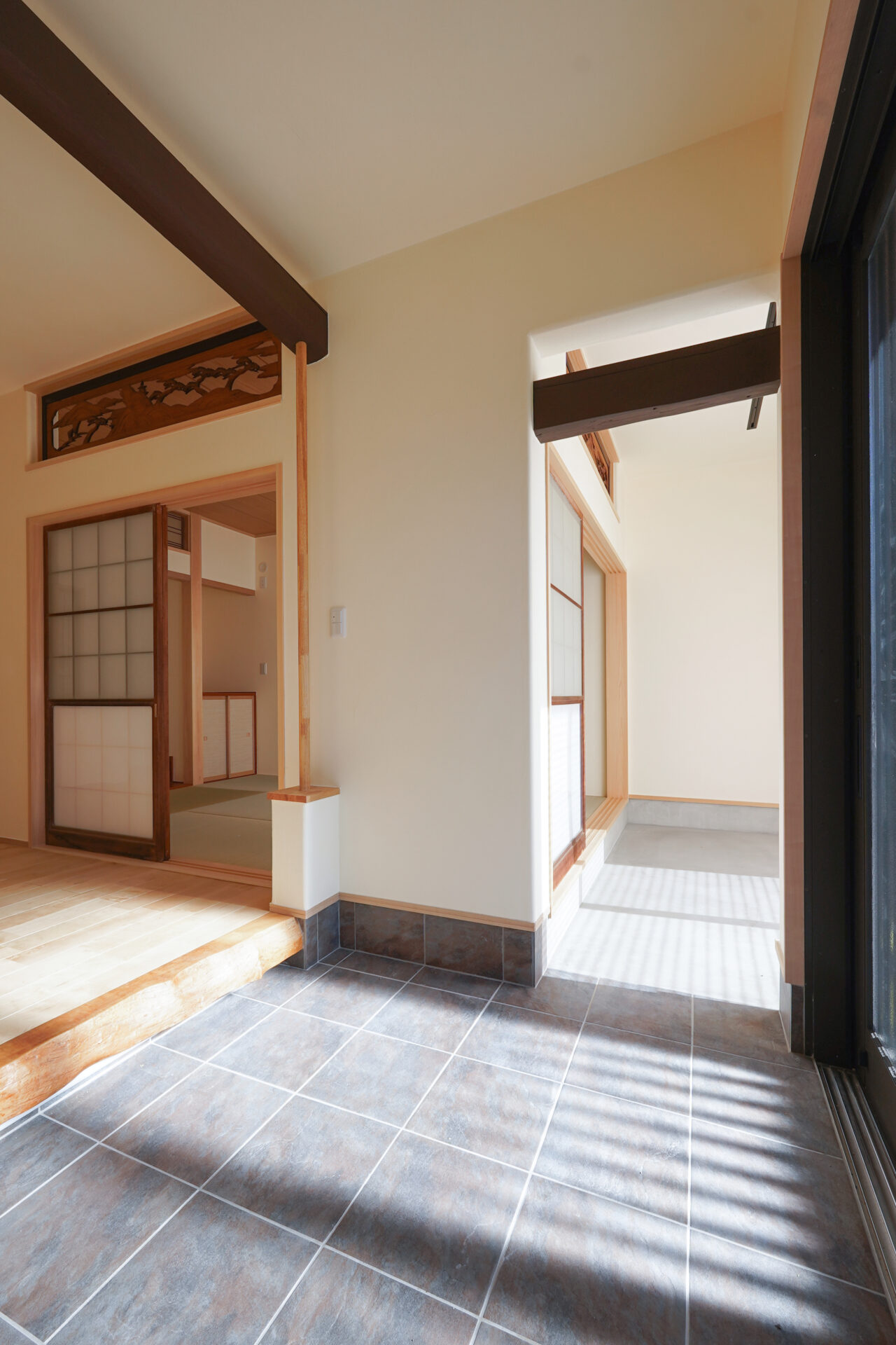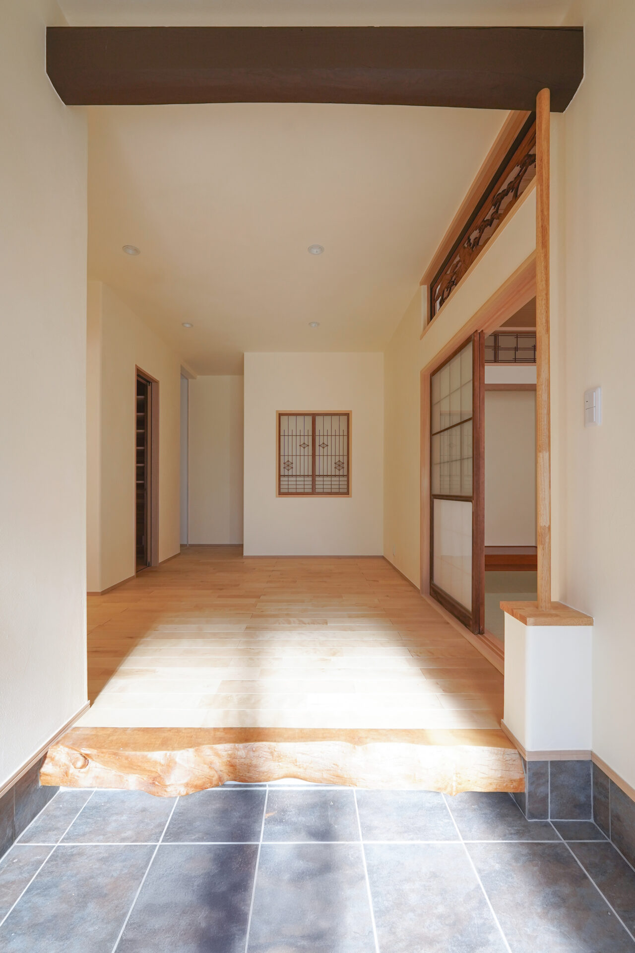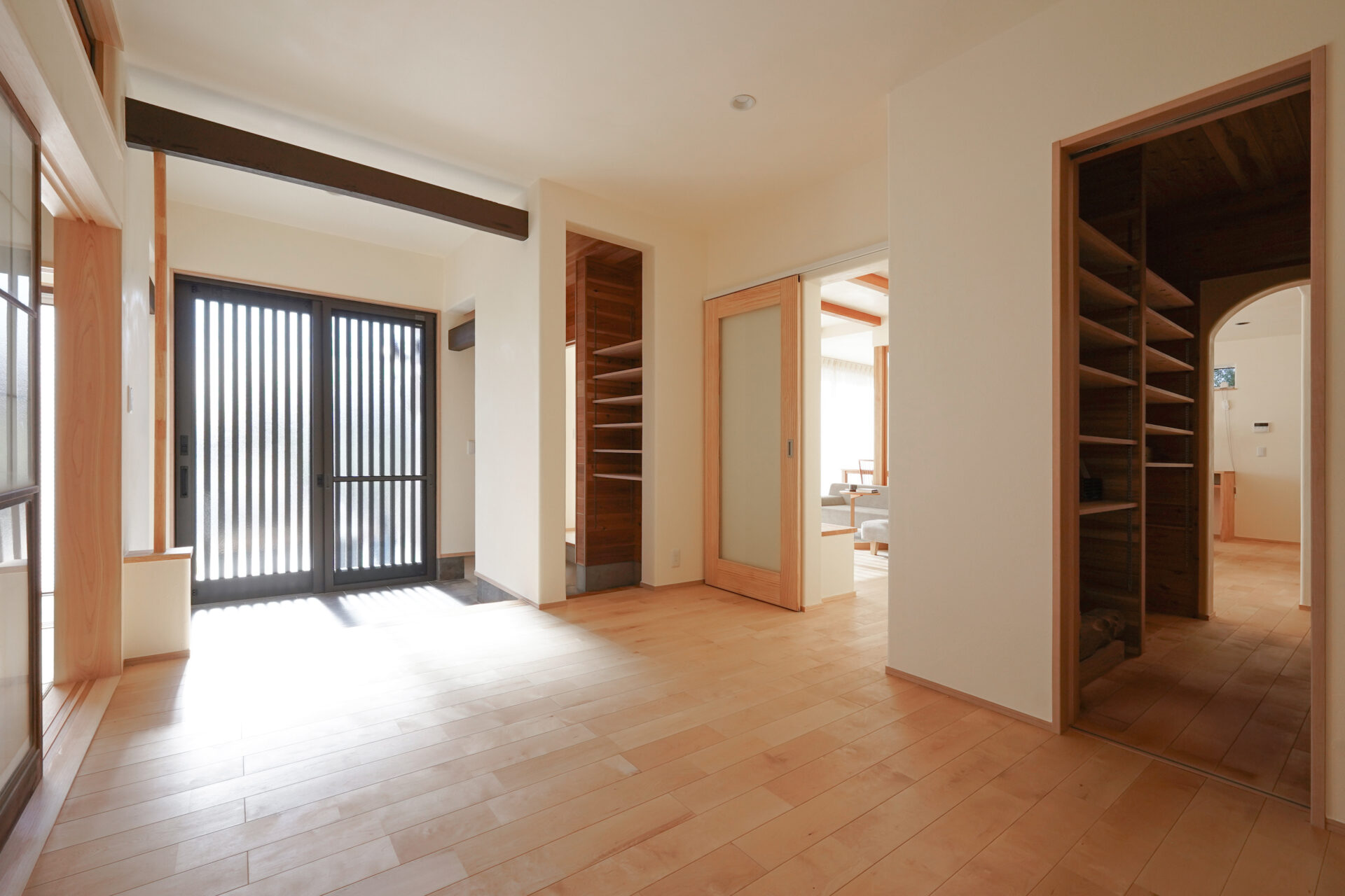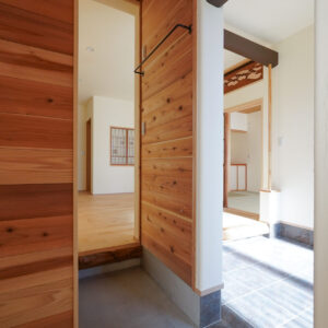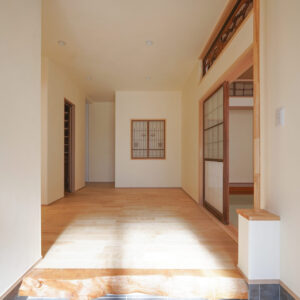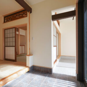 約7帖のゆとりある玄関ホールは、土間を介して各空間へとつながる設計。右手に和室、左手にLDKを配置し、来客用と家族用の動線を緩やかに分けています。旧家の建具や木材を随所に再利用し、住まいに温もりと懐かしさを添えました。