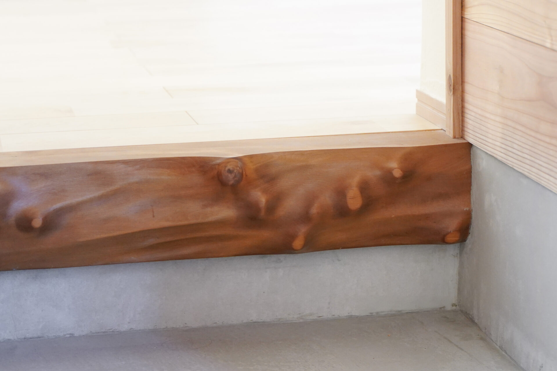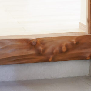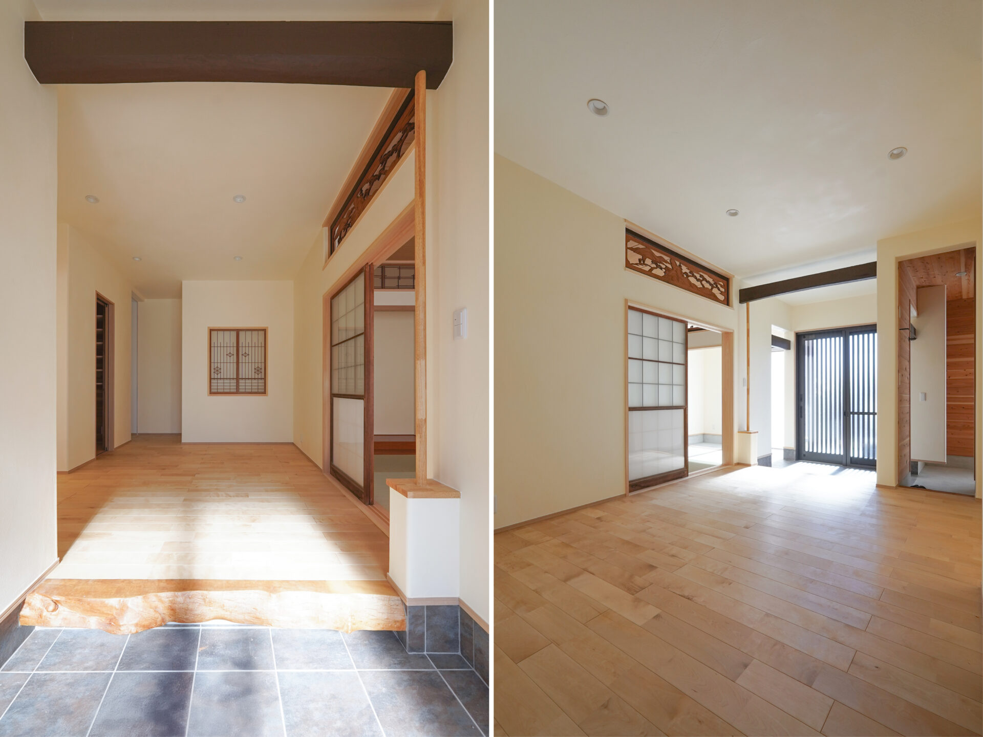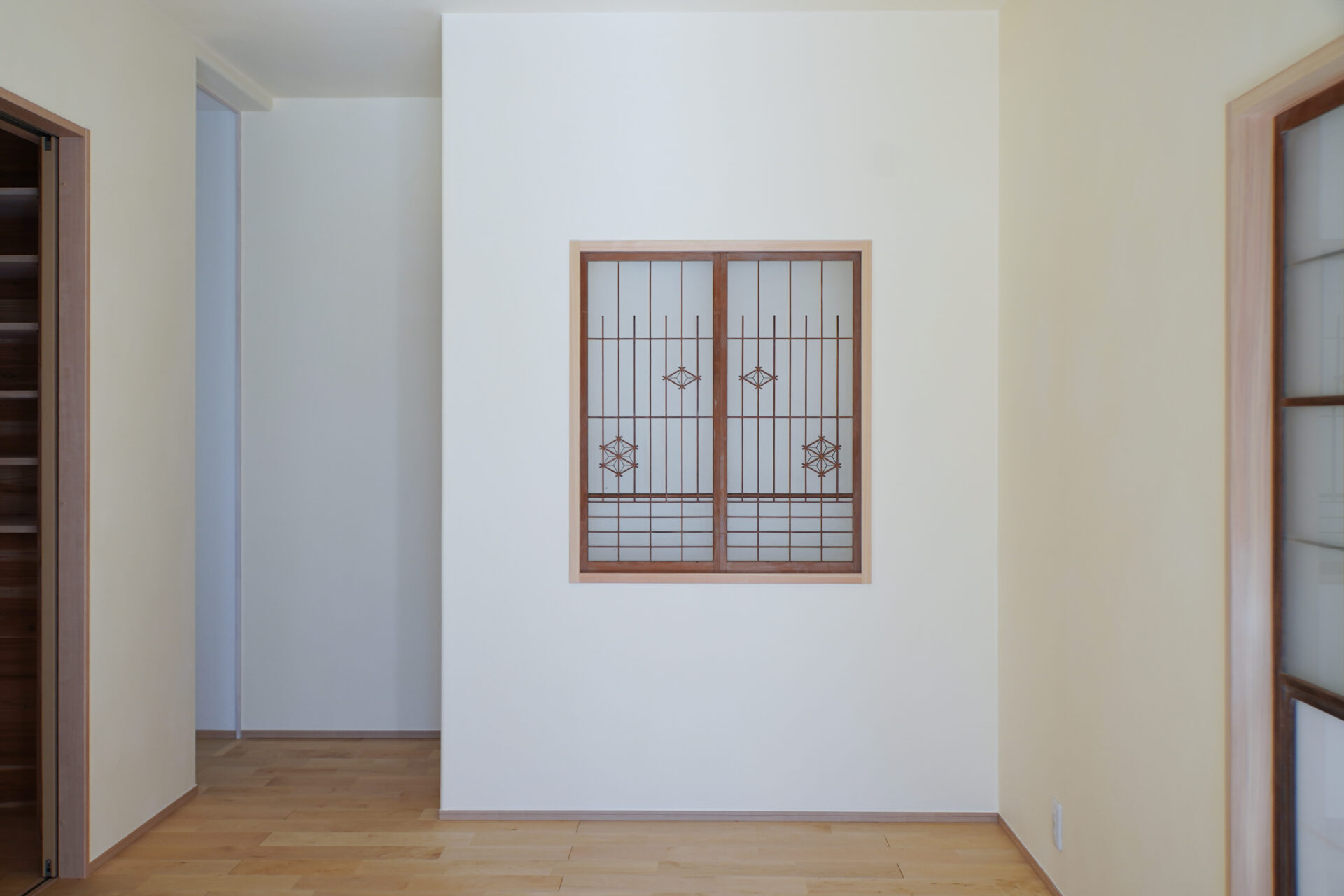約7帖のゆとりある玄関ホールは、土間を介して各空間へとつながる設計。右手に和室、左手にLDKを配置し、来客用と家族用の動線を緩やかに分けています。旧家の建具や木材を随所に再利用し、住まいに温もりと懐かしさを添えました。
