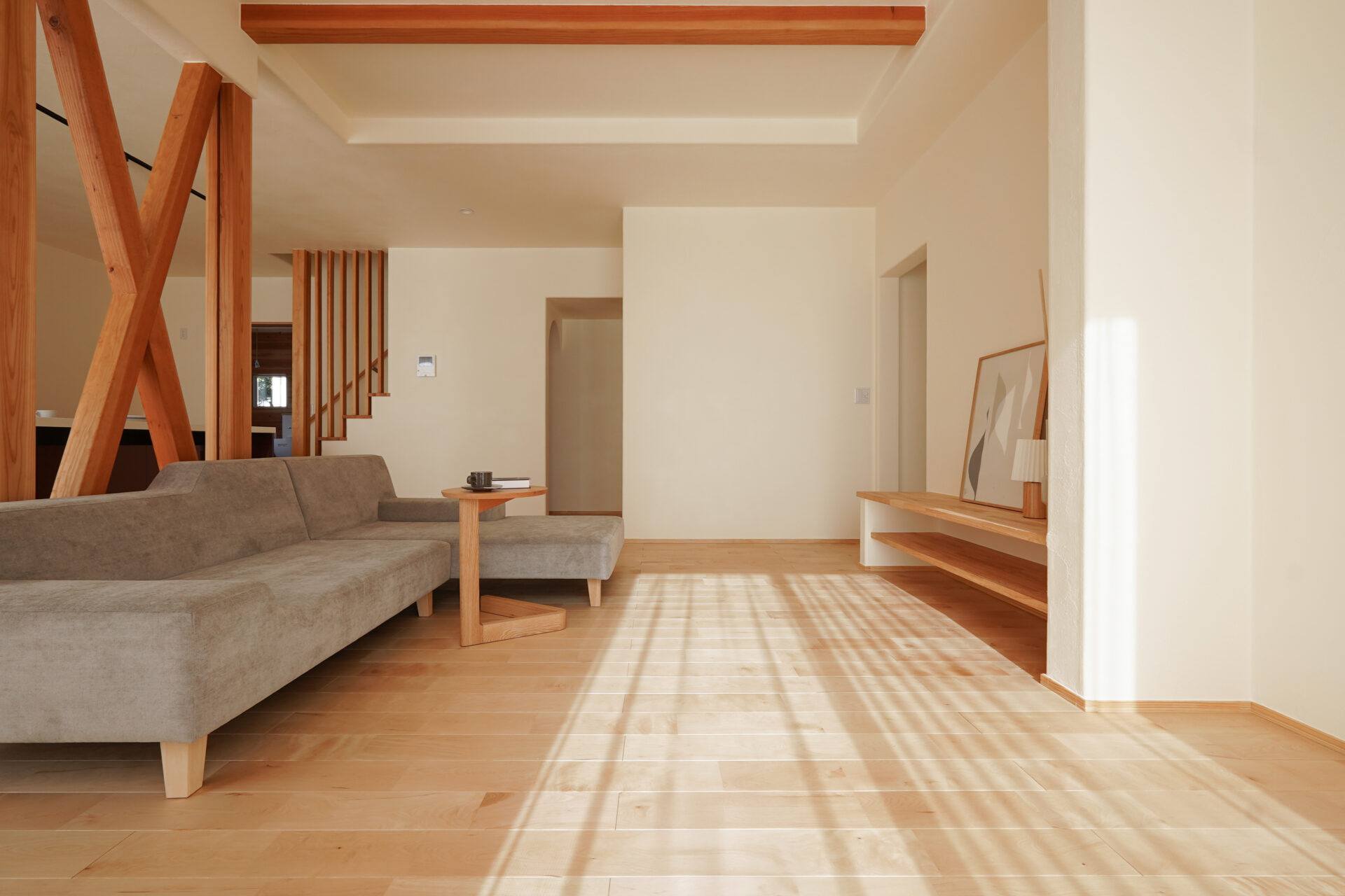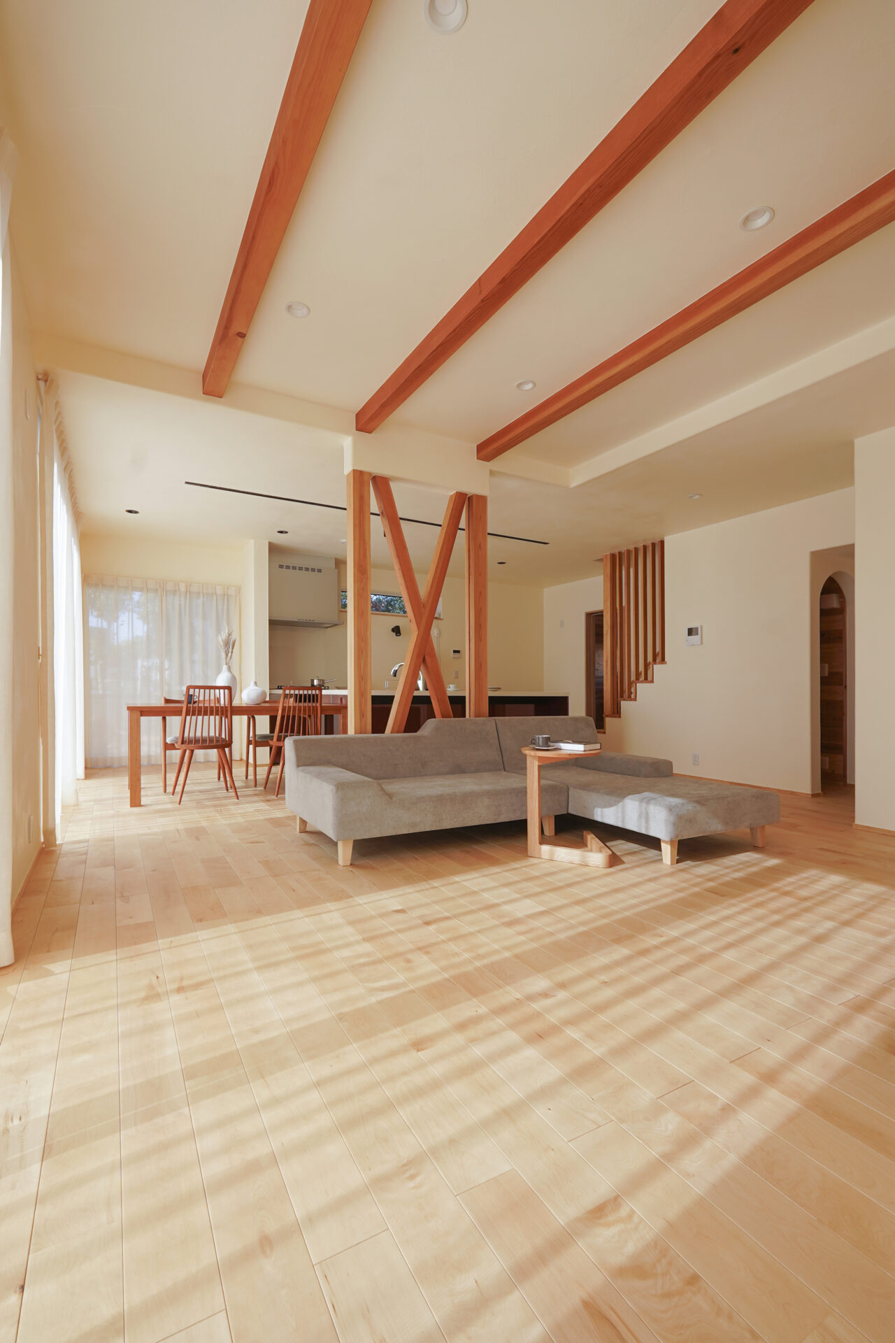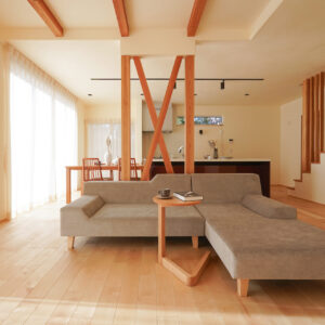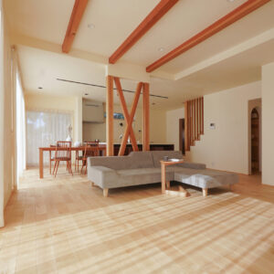広々としたLDKの中央には、構造上必要な柱をあえて現しにし、空間のアクセントとしながらリビングとダイニングを緩やかにゾーニング。南面の掃き出し窓の先には段差なくつながるウッドデッキを設え、内と外が心地よくつながる開放的な空間としました。
