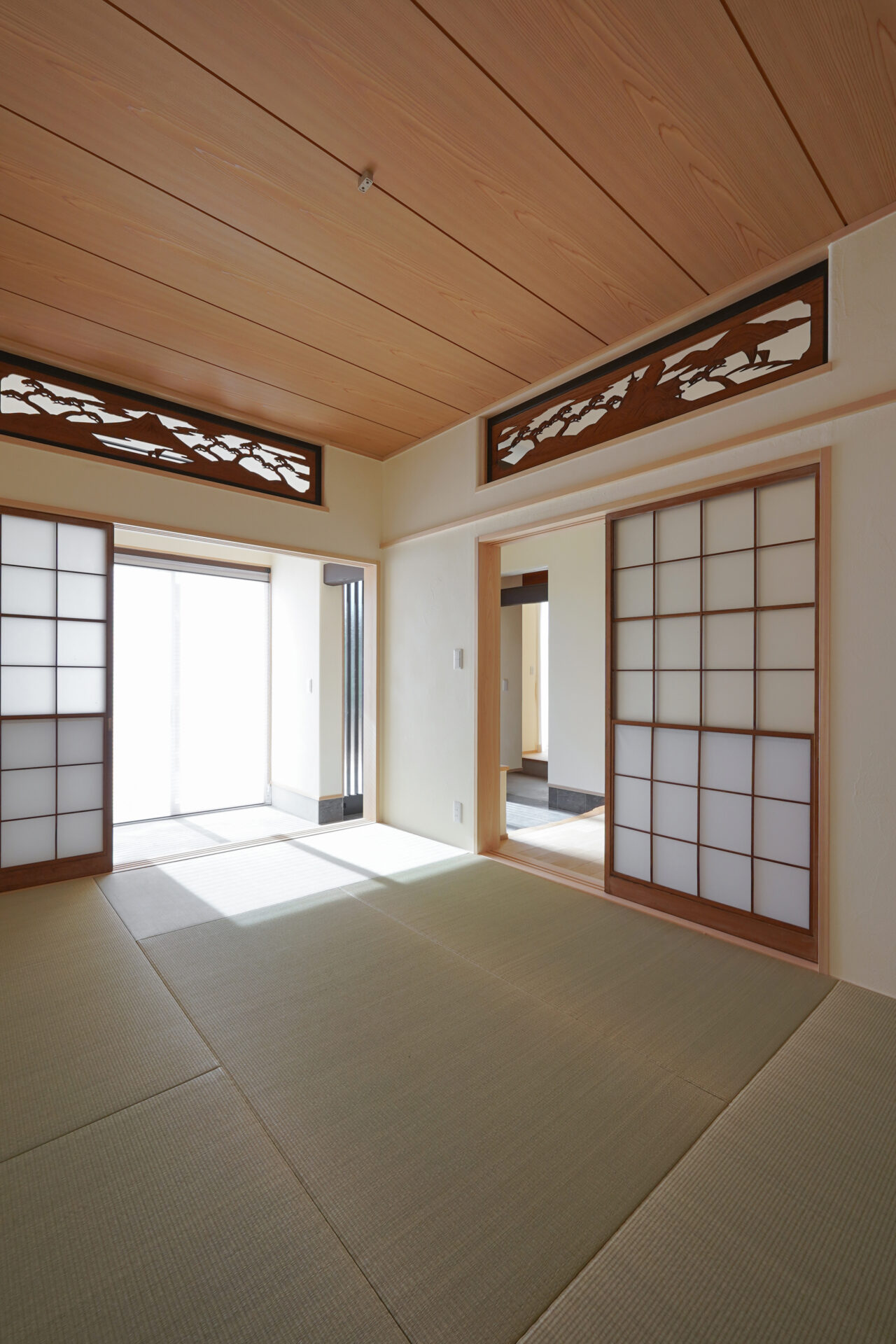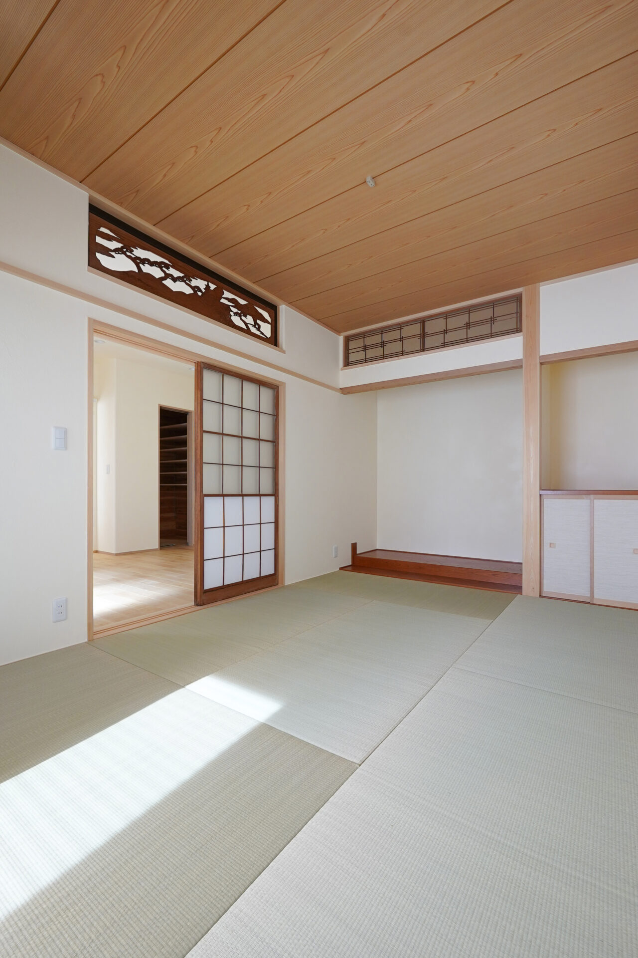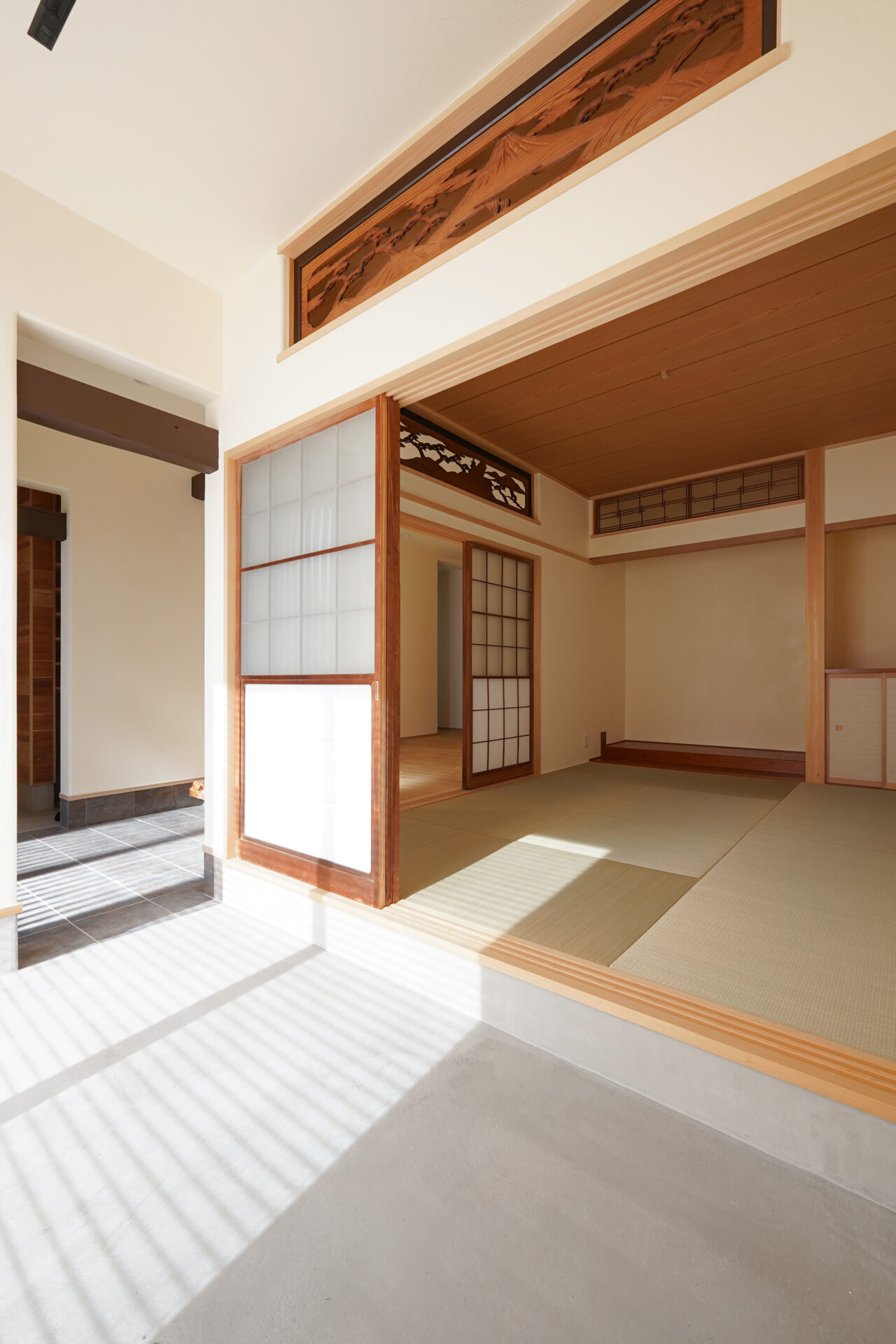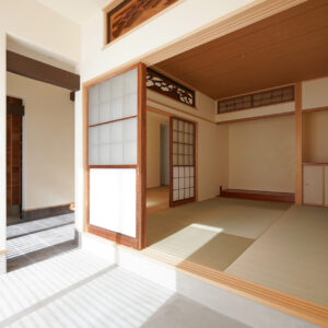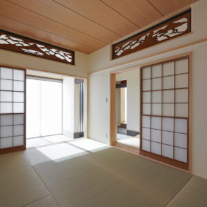 縁なしの半帖畳が美しい約6帖の和室。旧家で使われていた欄間に施された繊細な木彫刻が和の趣を際立たせ、心落ち着く空間を演出しています。