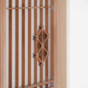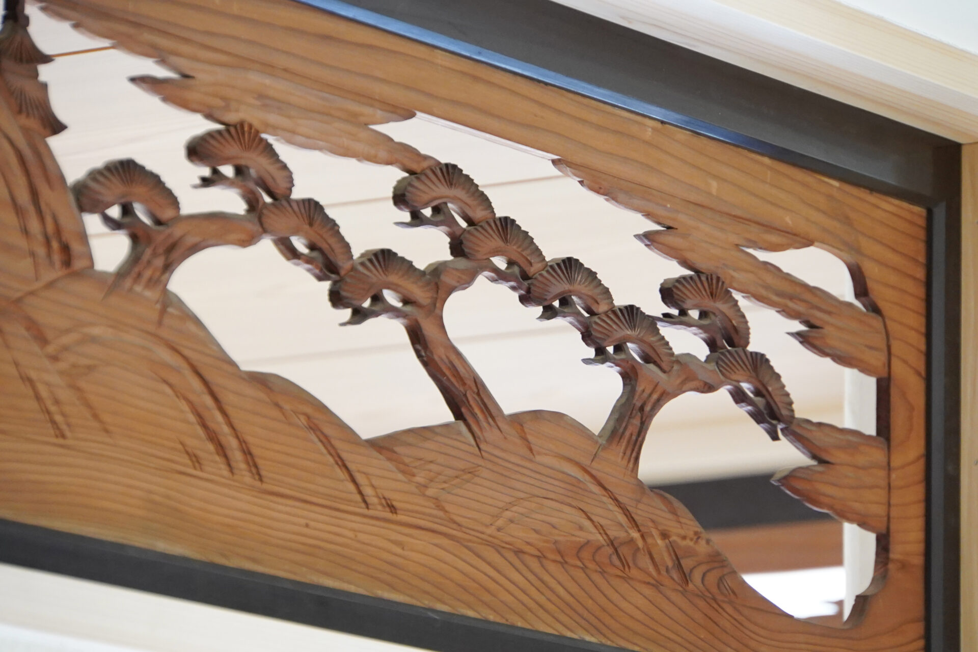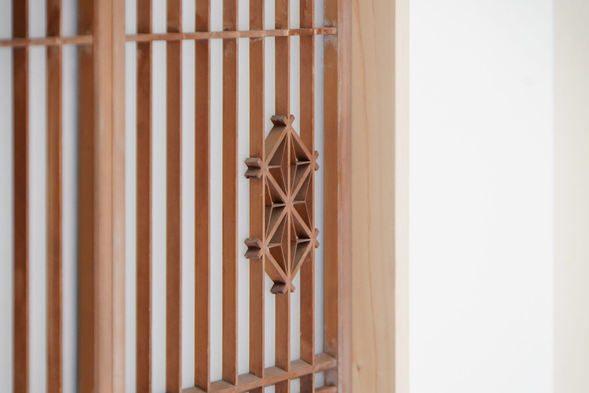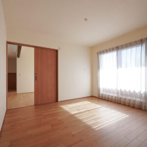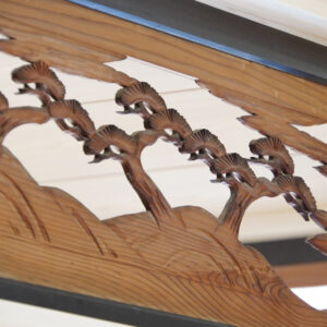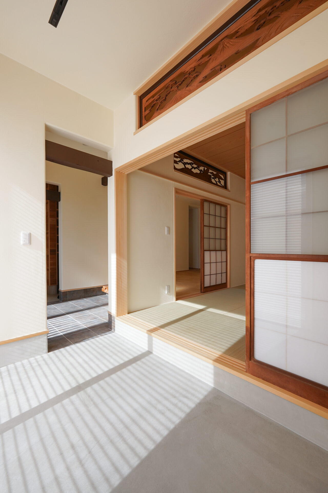 縁なしの半帖畳が美しい約6帖の和室。旧家で使われていた欄間に施された繊細な木彫刻が和の趣を際立たせ、心落ち着く空間を演出しています。