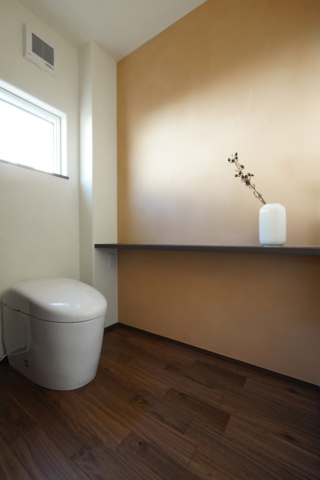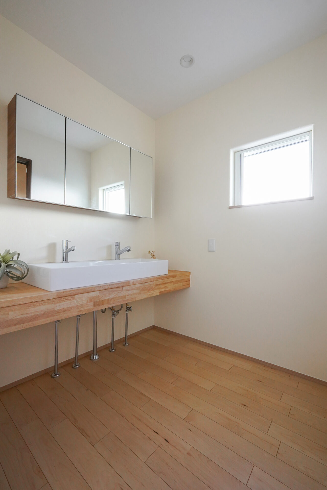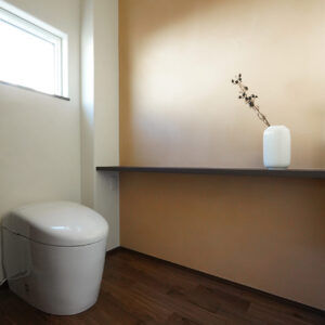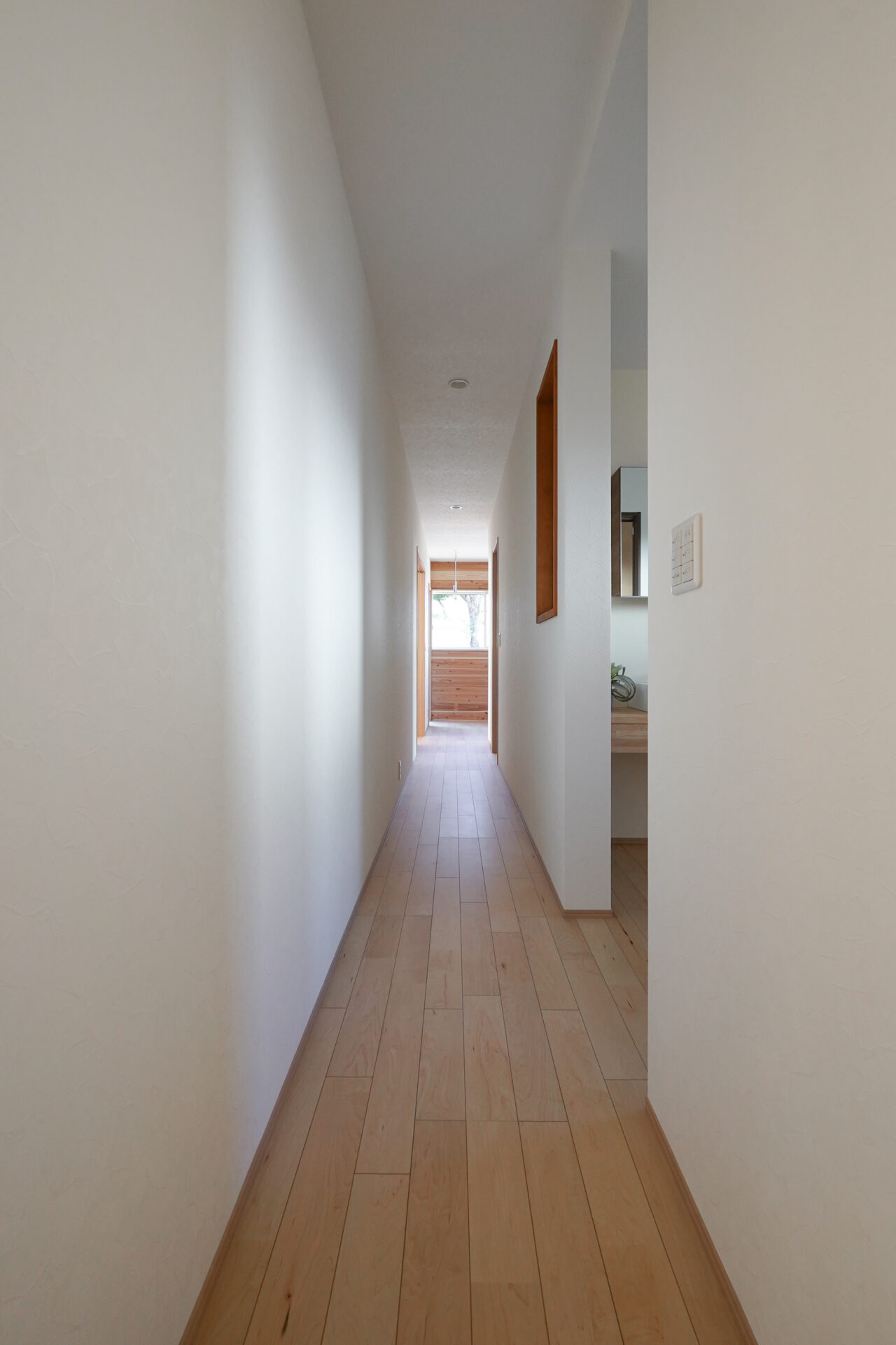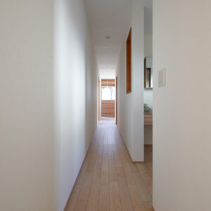 裏動線上の廊下に設けた約3帖のサニタリースペース。壁と天井には調湿性・消臭性に優れた珪藻土の塗り壁を採用し、水まわり空間の清潔感と快適さに配慮しています。