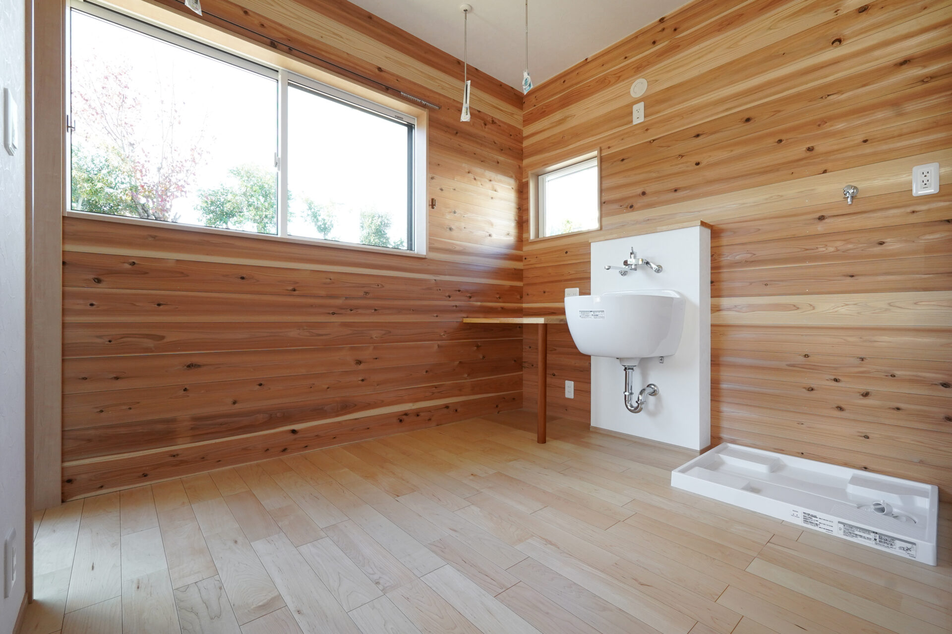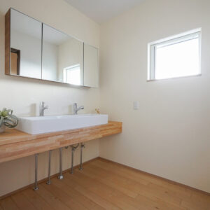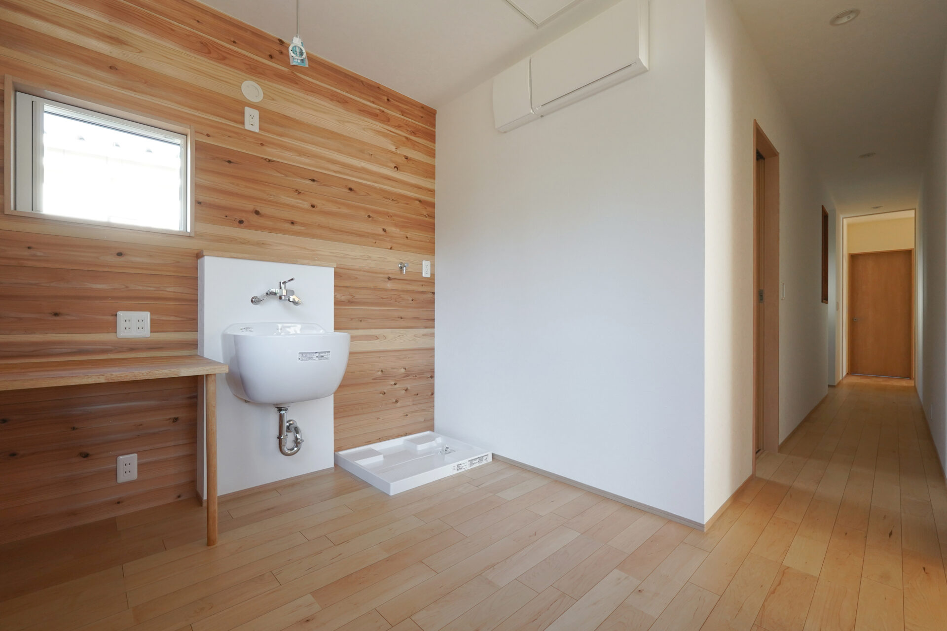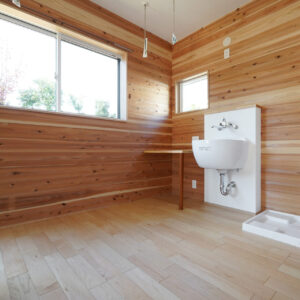 約4帖のランドリールームにはスロップシンクを備え、家事や屋外作業後の手洗いにも配慮。壁には調湿性能に優れた無垢の杉板を採用し、快適な室内環境を整えています。玄関ホールへと続く裏動線には、浴室やトイレ、洗面室を配置。