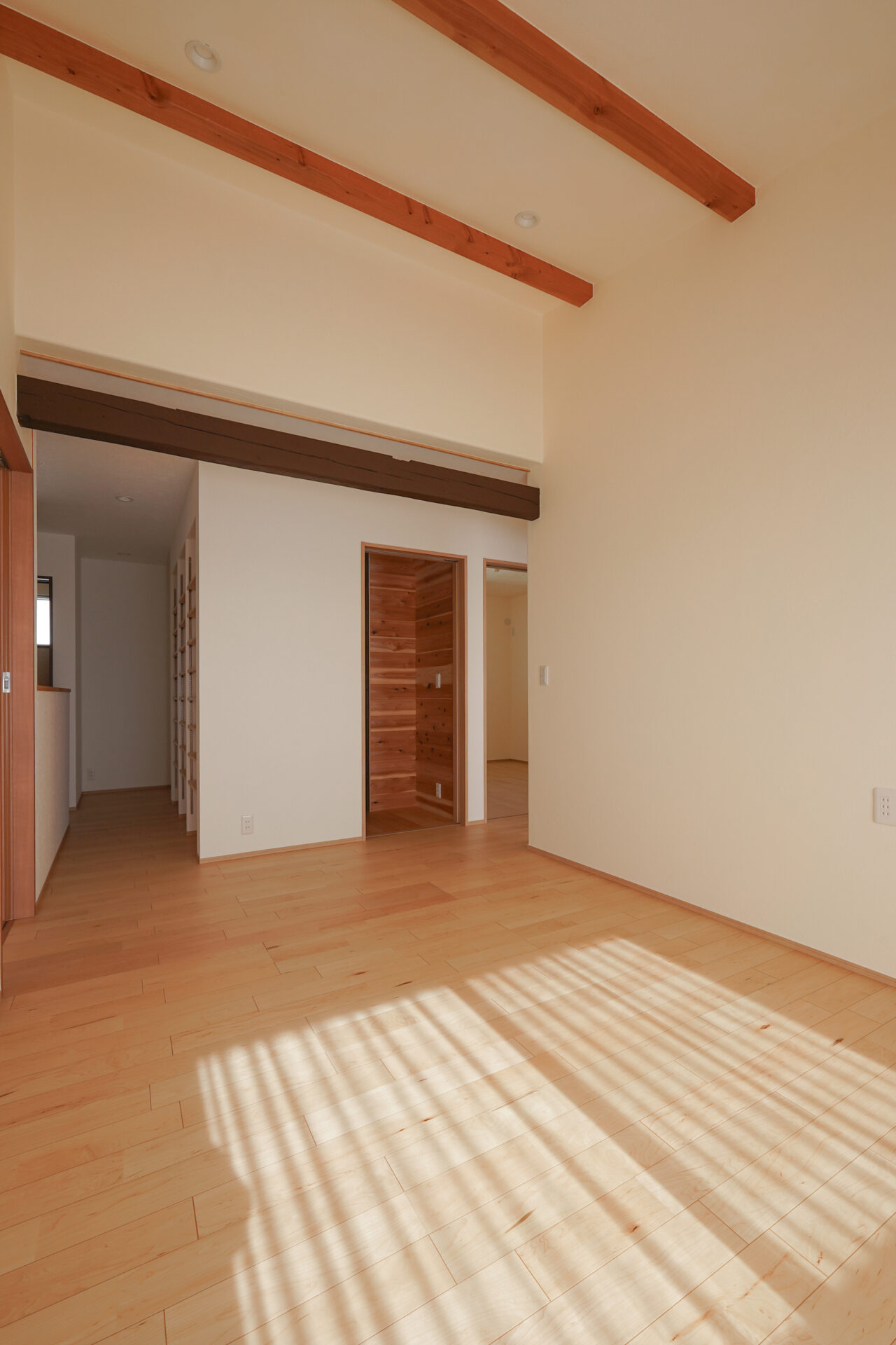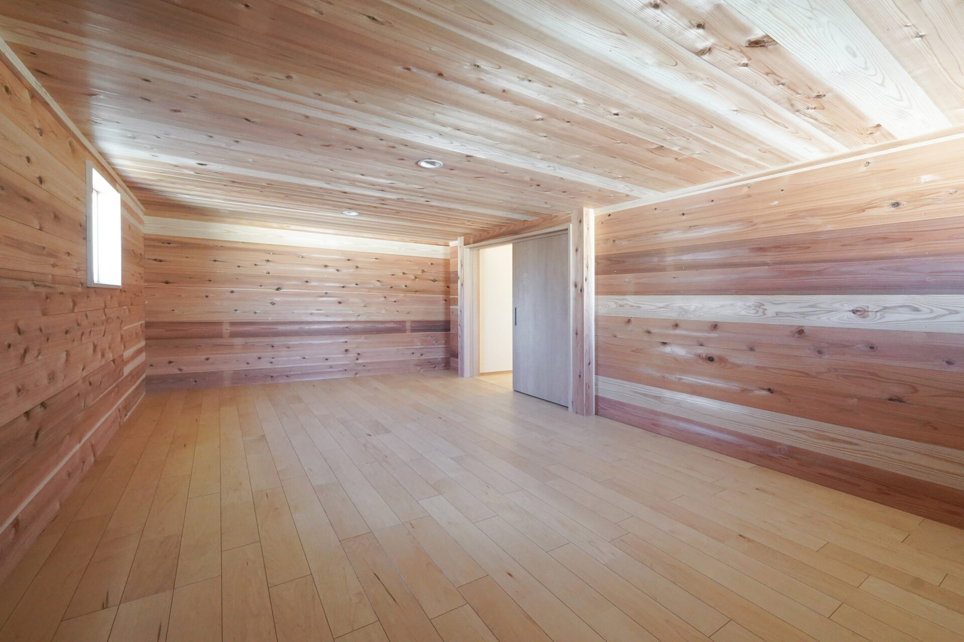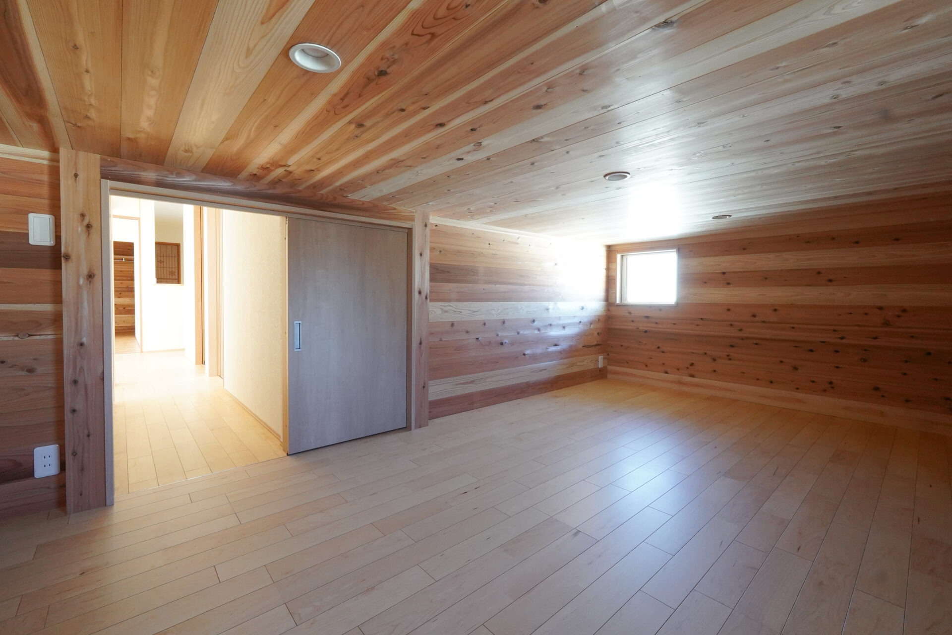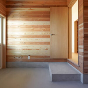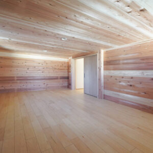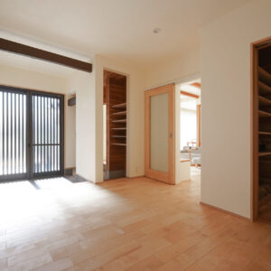 玄関の奥に設けられた約5帖の納戸は、屋外で使用する物やお庭の手入れに使う道具をすっきりと収められる、実用性に優れたスペースです。壁と天井は調湿効果や防虫効果の高い無垢の杉板で仕上げられています。