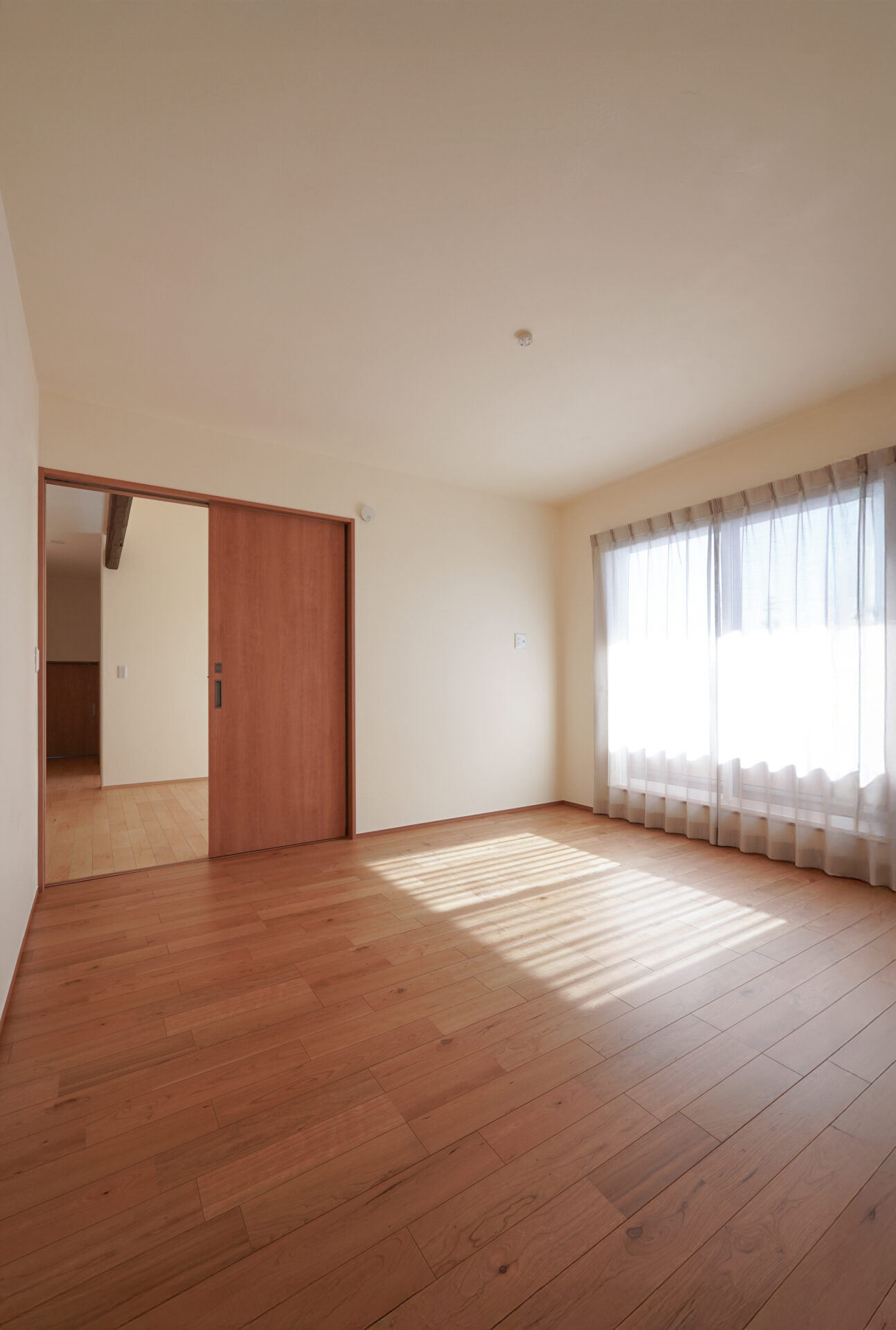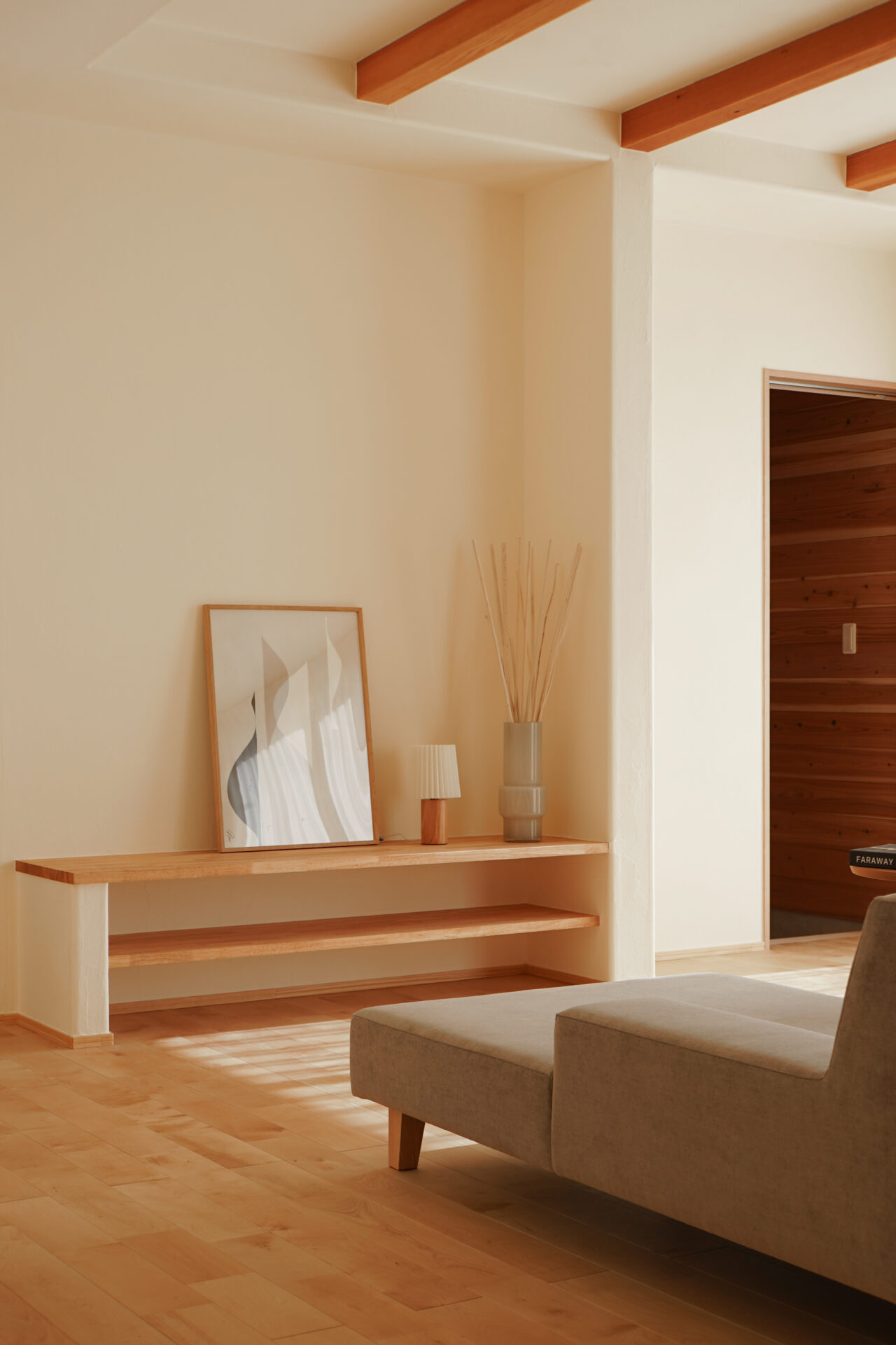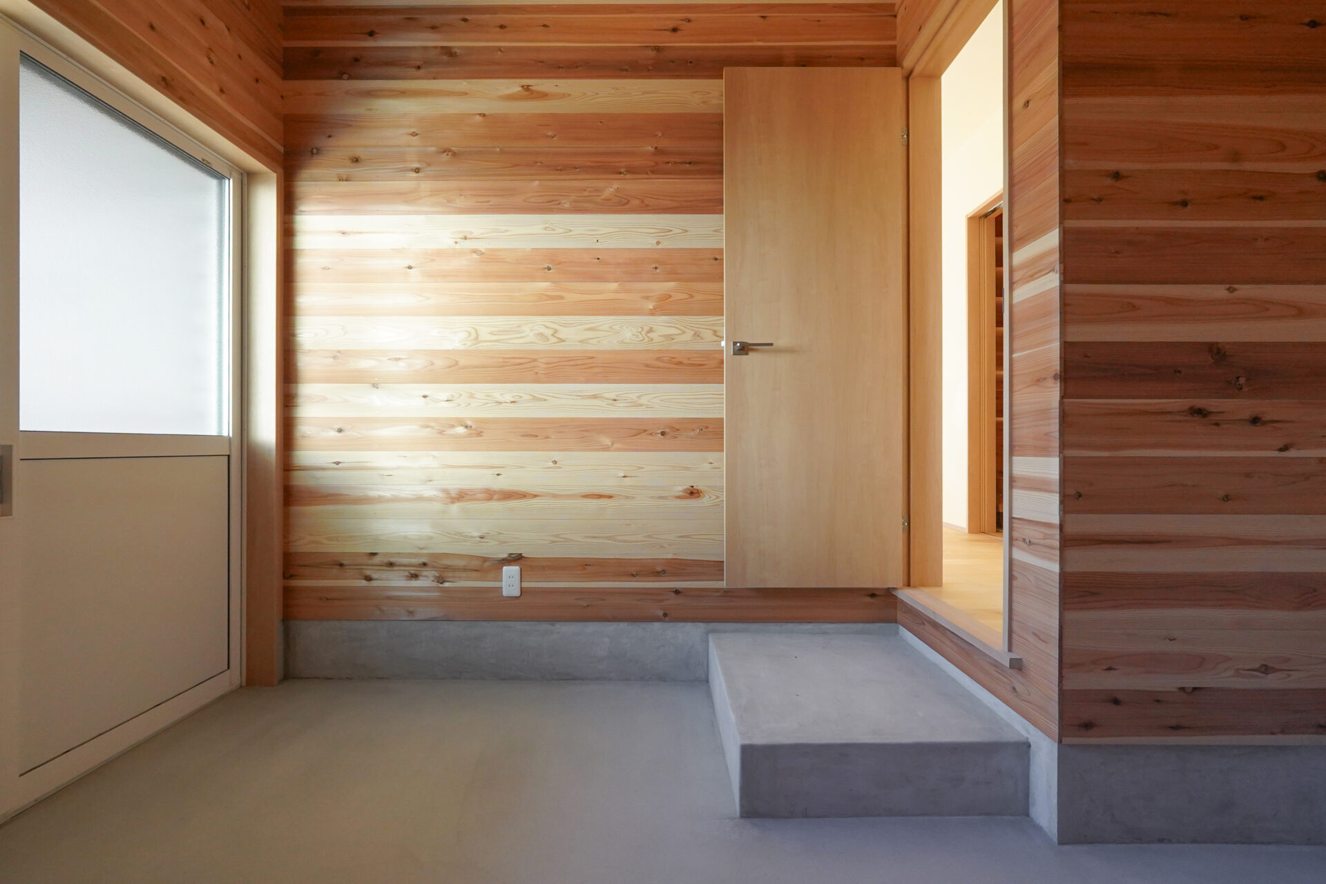 玄関の奥に設けられた約5帖の納戸は、屋外で使用する物やお庭の手入れに使う道具をすっきりと収められる、実用性に優れたスペースです。壁と天井は調湿効果や防虫効果の高い無垢の杉板で仕上げられています。