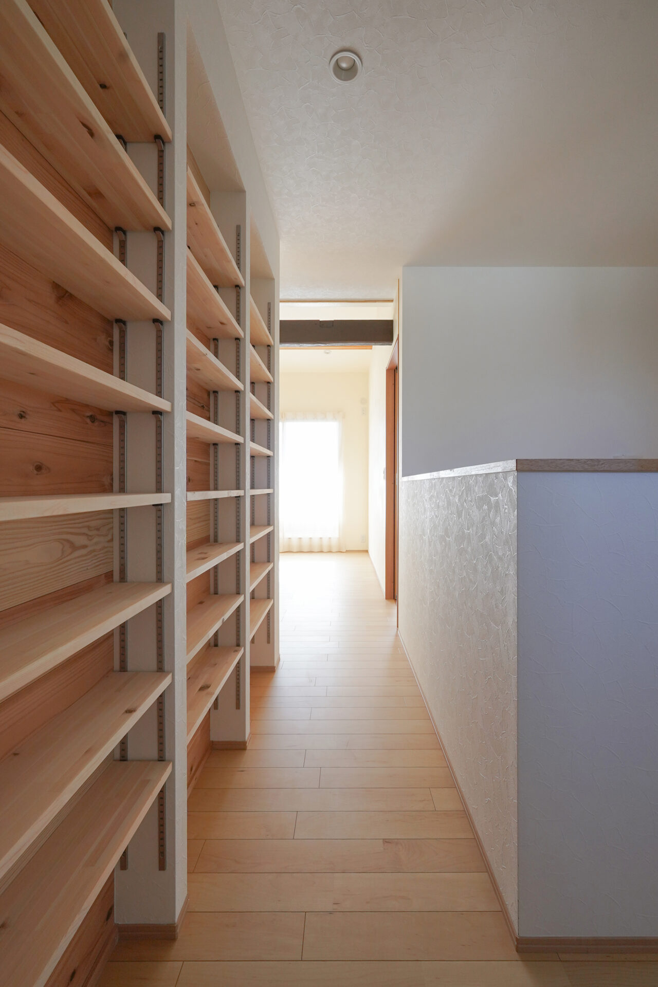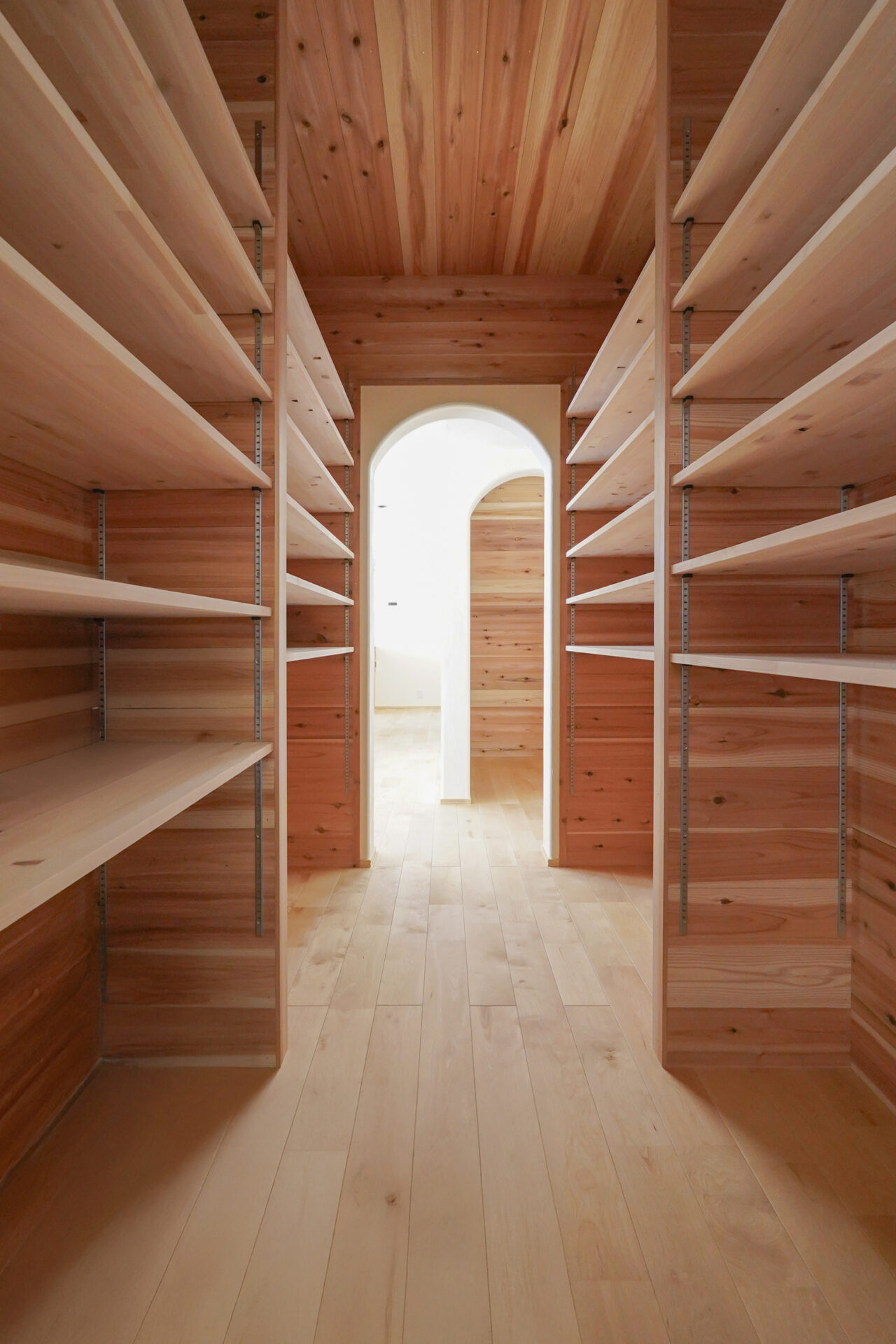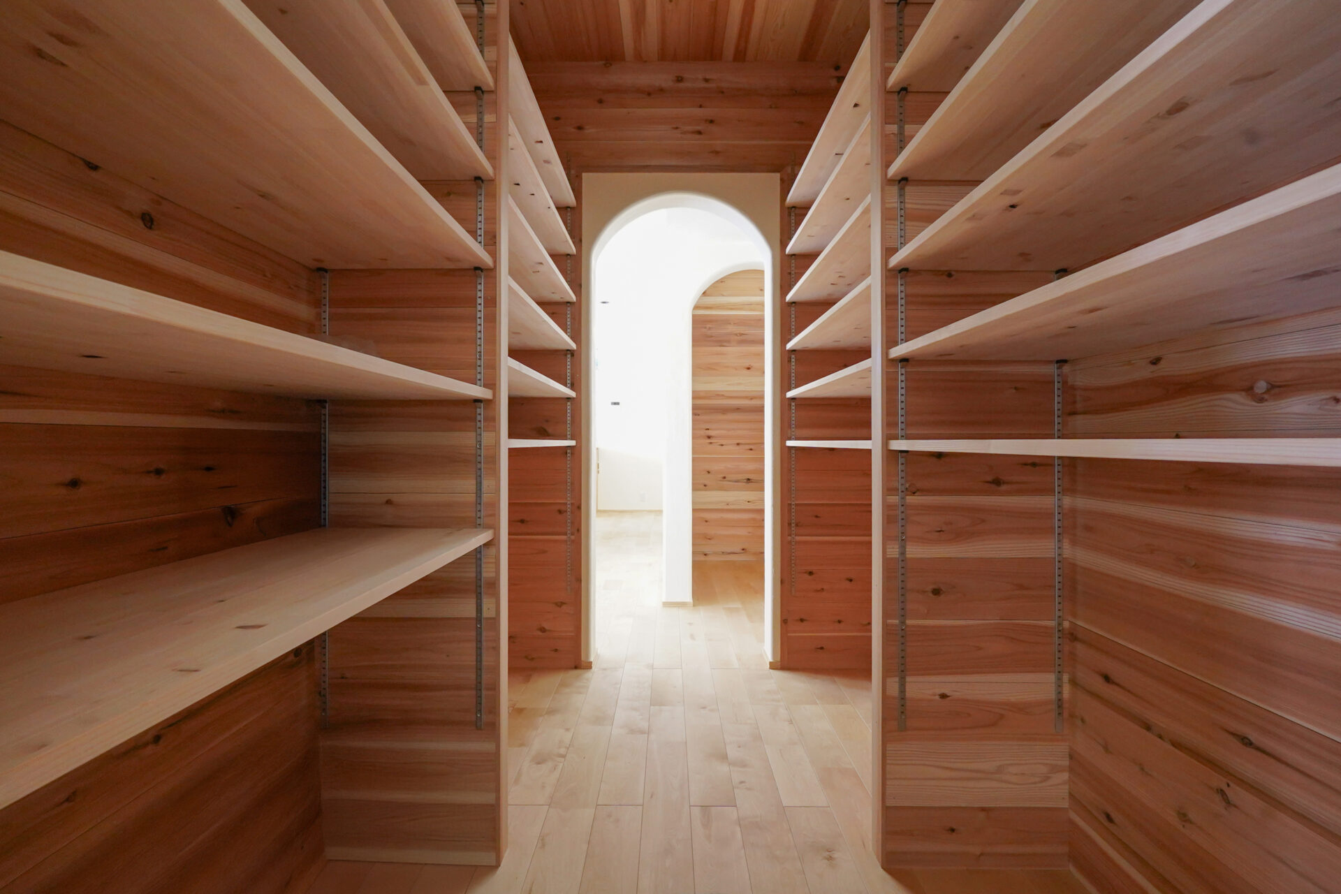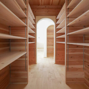 杉板をふんだんにあしらった約3帖のウォークスルークローゼット兼パントリーには、24段の可動棚を設置。玄関ホールからLDKへと続く動線上に設けることで、収納力と暮らしの利便性を大きく高めています。