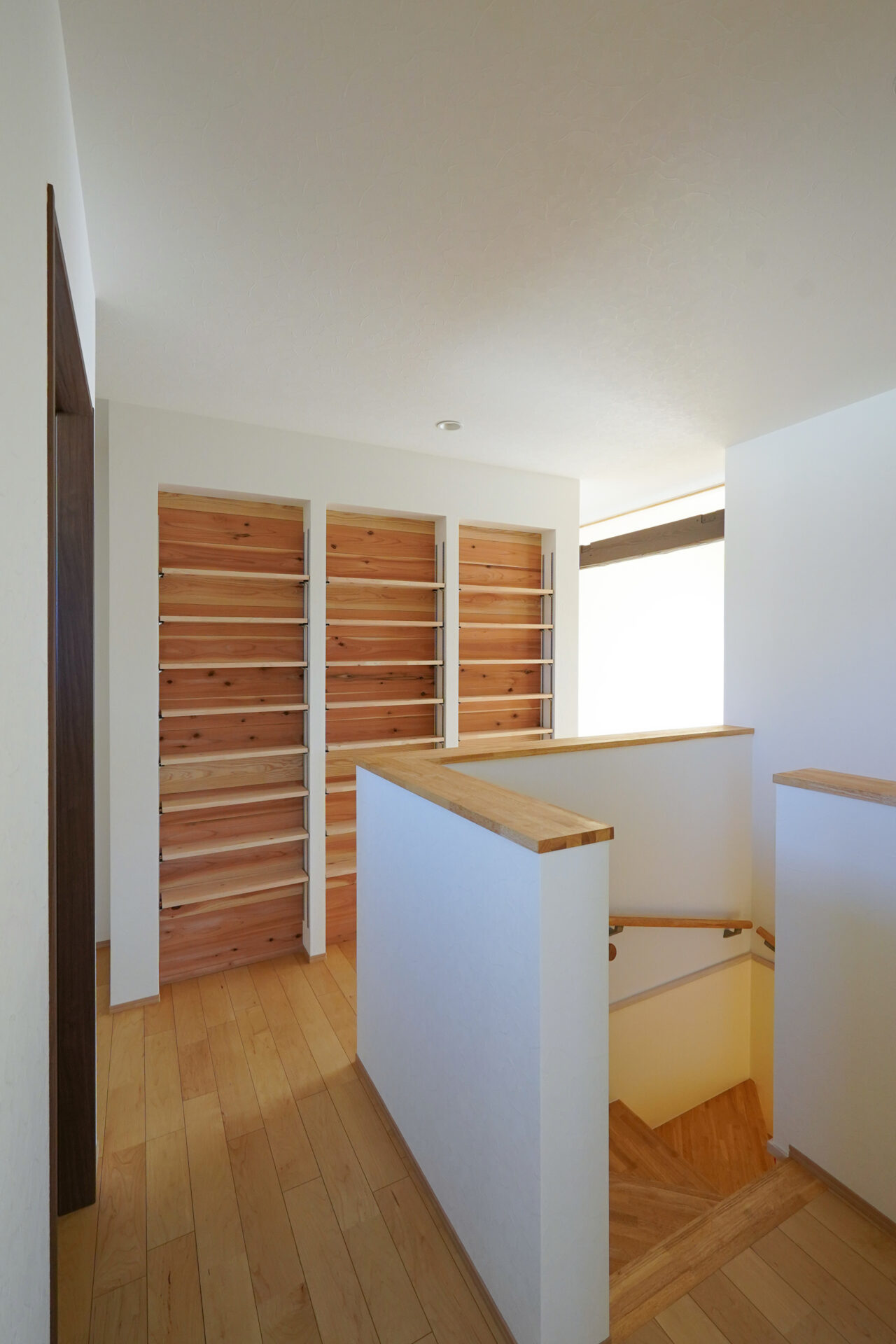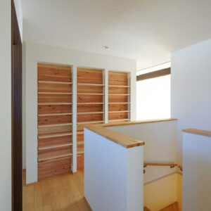 階段を上がった先の2階ホールには、大容量の書棚を設置。漫画や文庫本をはじめとした書籍を並べられる可動棚を備え、本のサイズに合わせて高さを調整できる仕様としています。