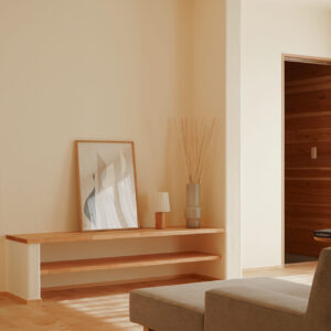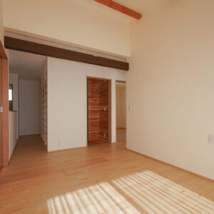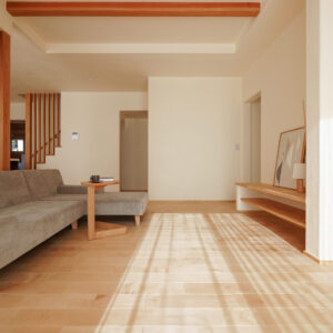 高天井が生み出す開放感に包まれた、約25帖の広々としたLDK。床にはカバ材の無垢フローリングを、壁には調湿性・消臭性に優れた漆喰の塗り壁を採用し、自然素材の温もりと心地よさが、空間全体の快適な空気環境を保ちます。