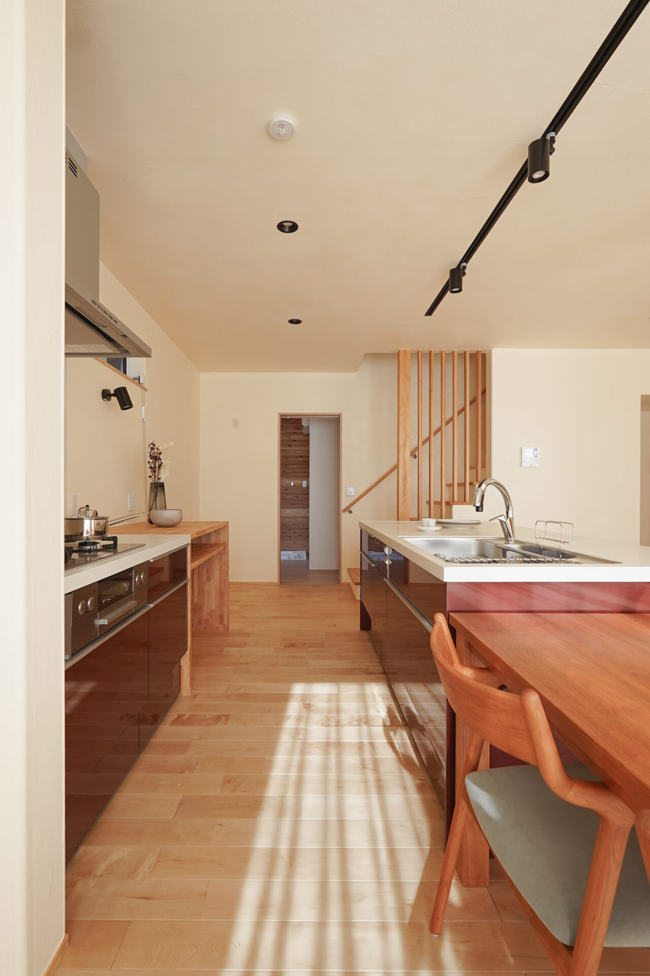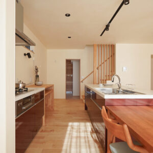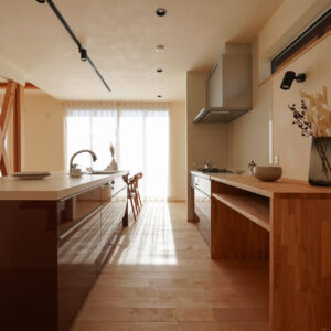 キッチンは、シンクとコンロそれぞれに作業スペースを確保したⅡ型キッチンを採用。調理中もダイニングやリビングに視線が届き、家族の気配を感じられます。キッチンの奥には、水回り空間へとつながる効率の良い家事動線を設置。