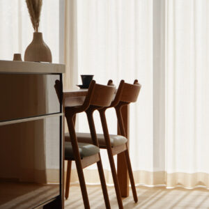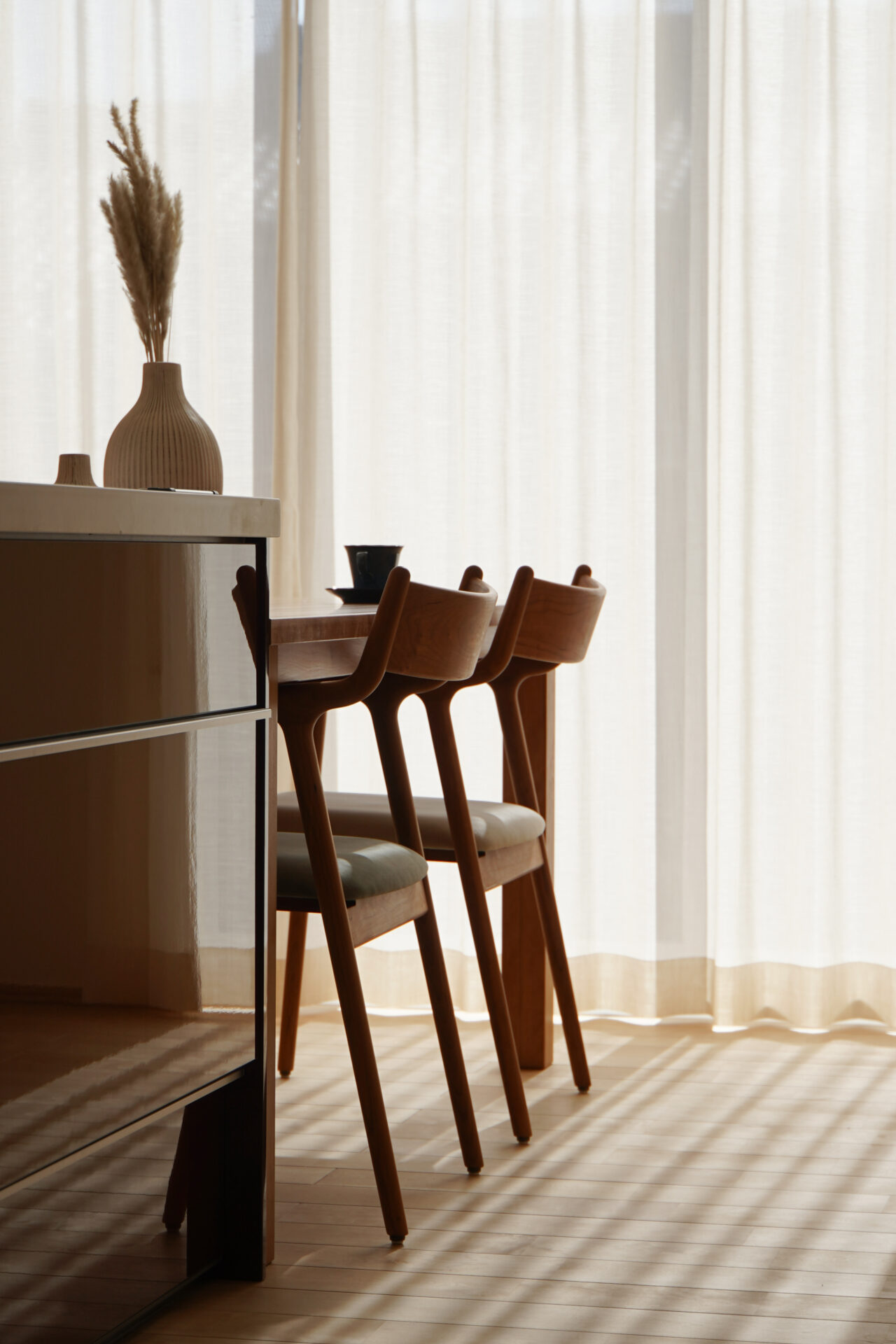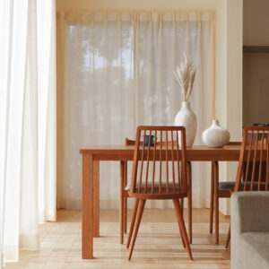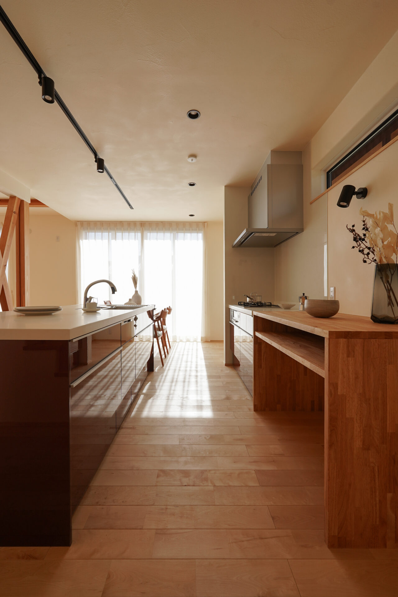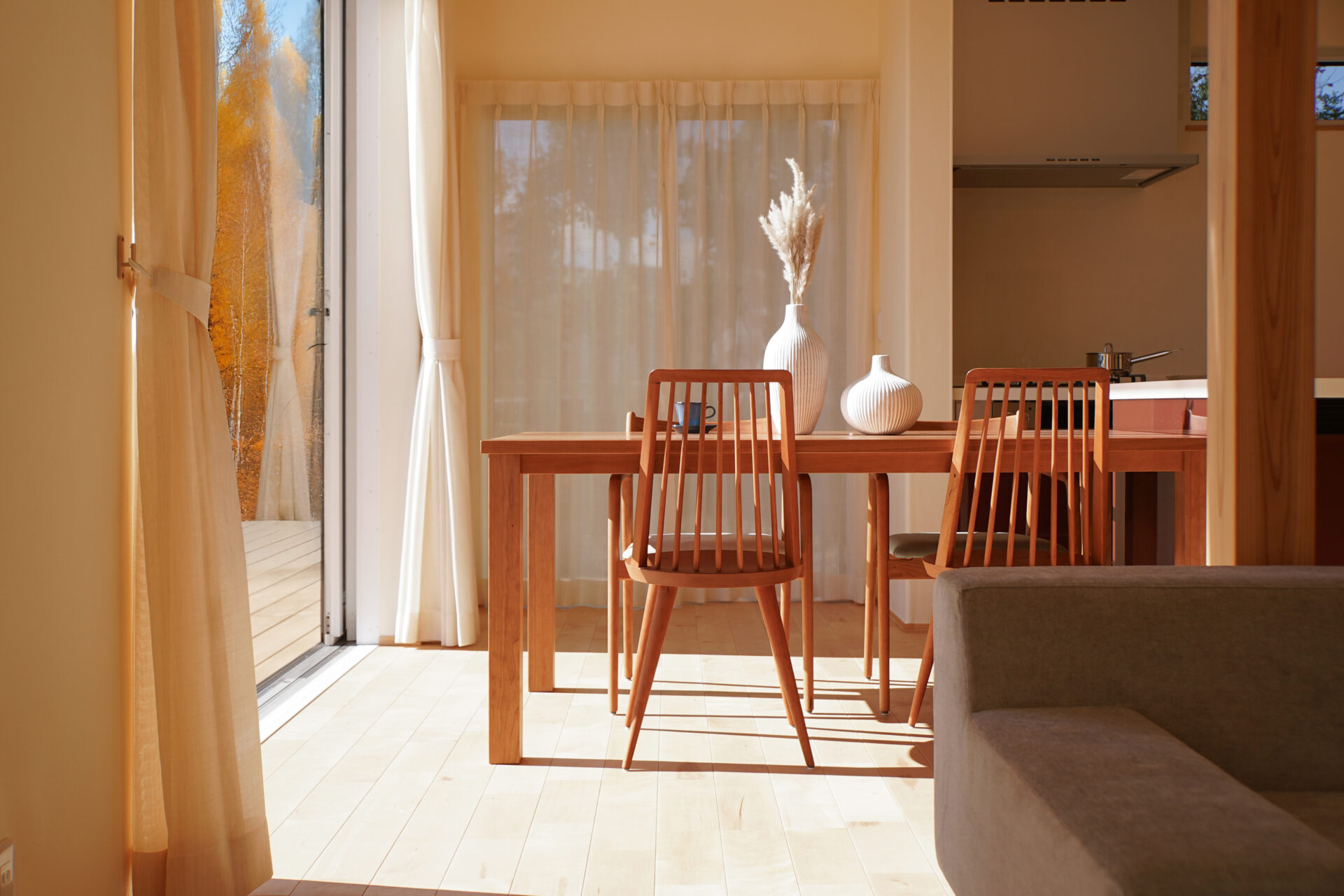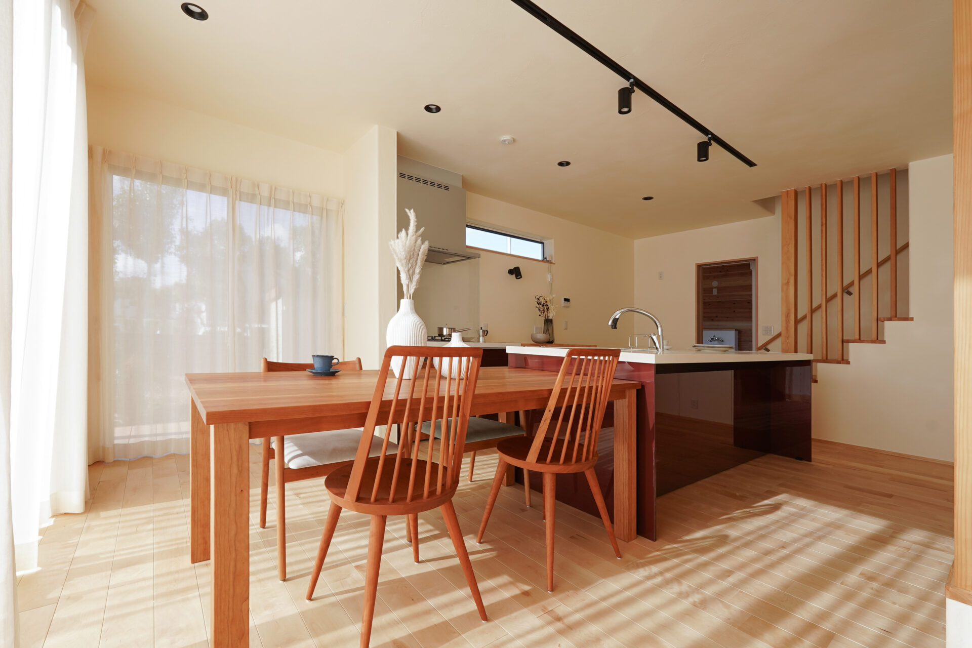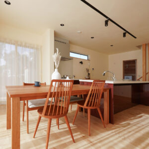 アイランドキッチンと横並びに配置したダイニングスペースは、配ぜんや片付けがスムーズで、日々の家事にゆとりをもたらします。窓から差し込む自然光とともに、季節の移ろいを感じられる心地よい空間です。