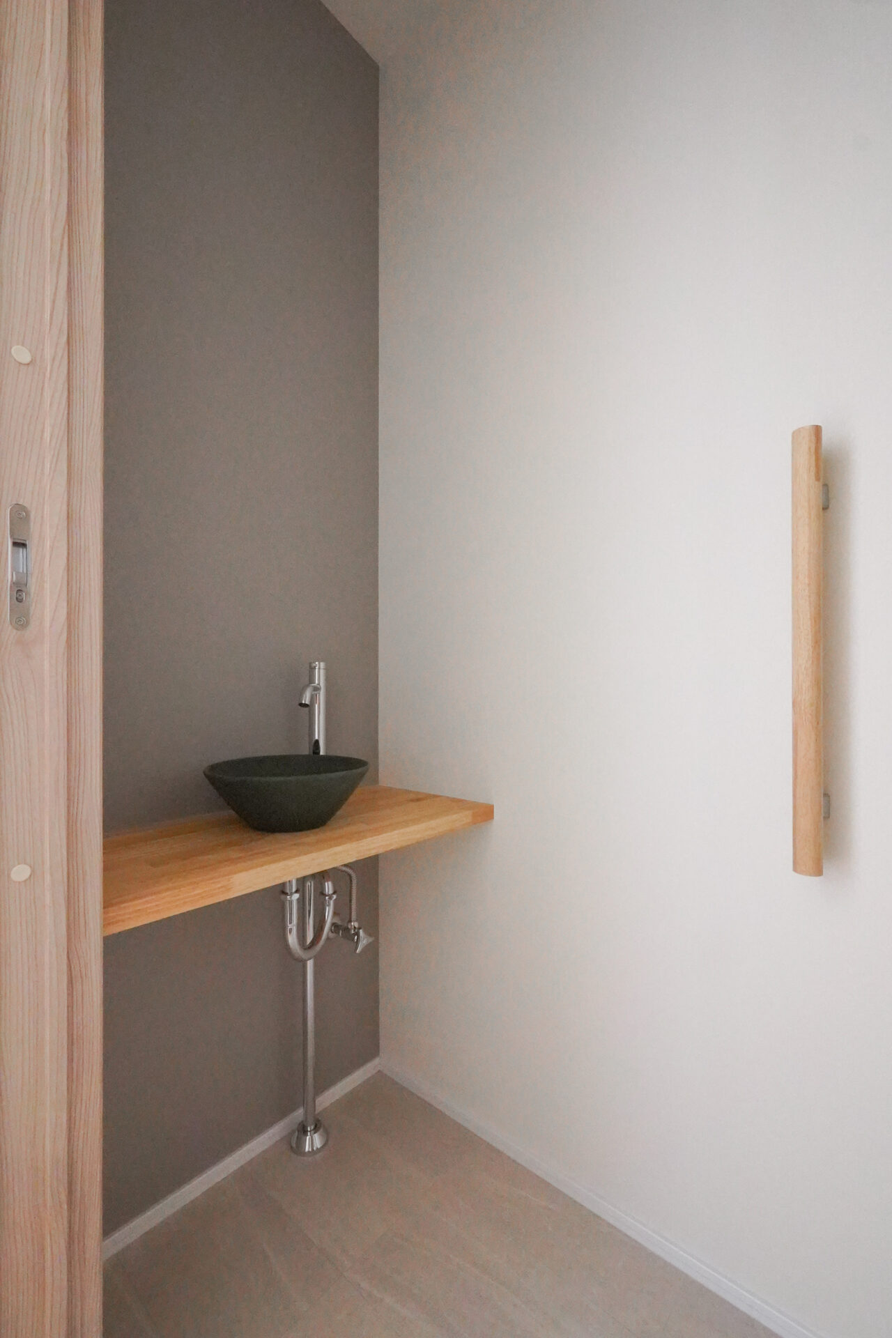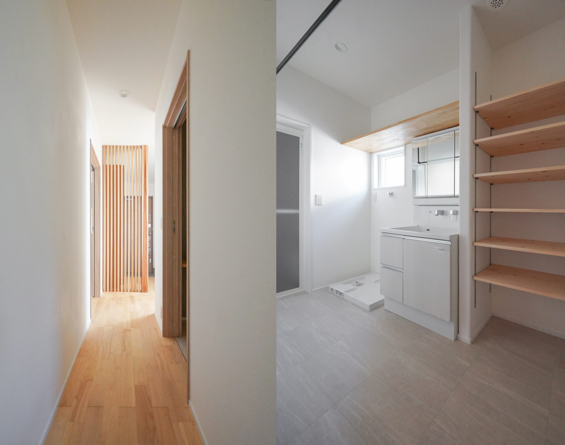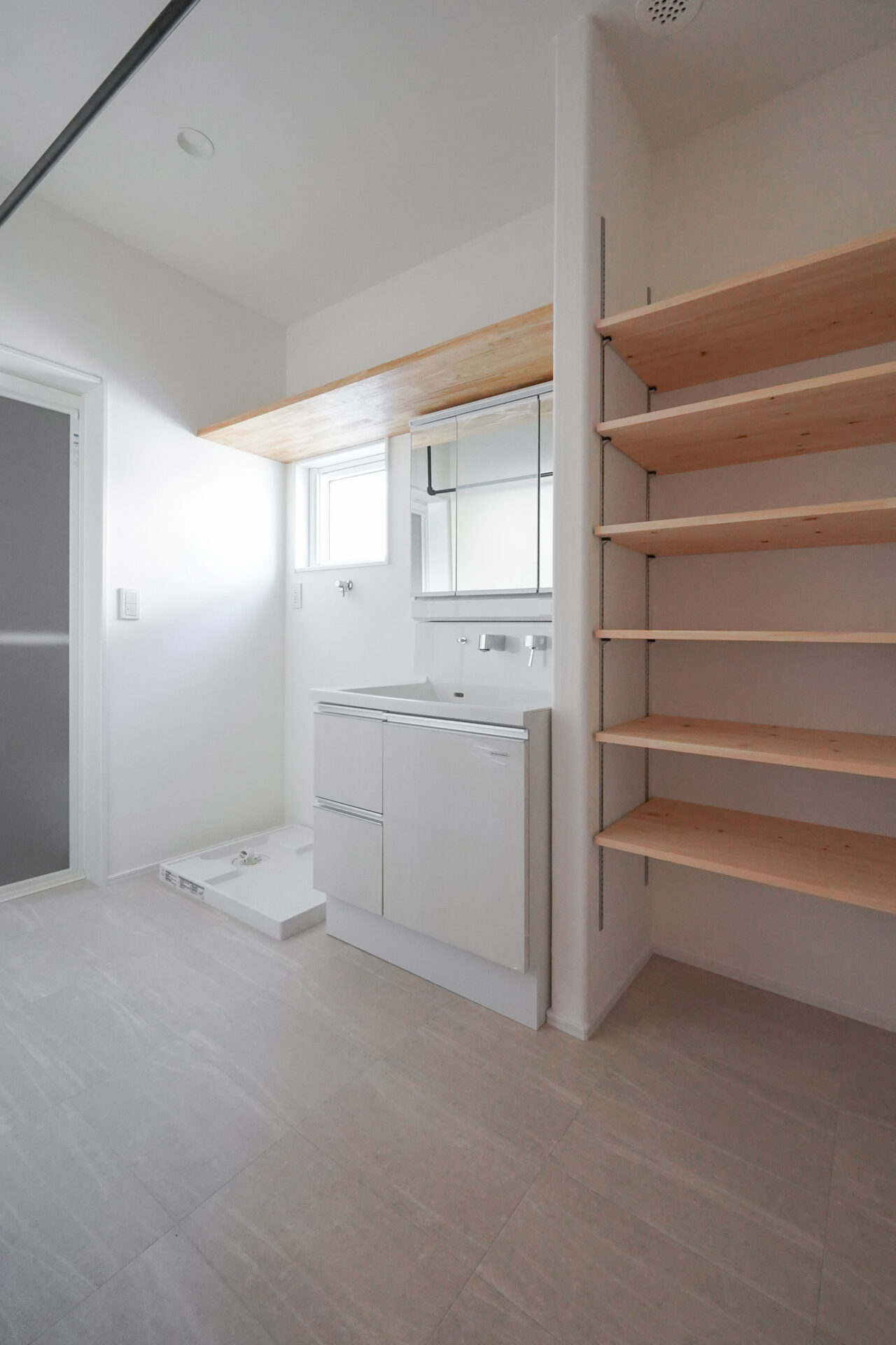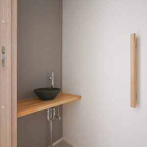 玄関の先に広がる親世帯の水回り空間。ハンガーパイプを備えた約3帖の洗面洗濯脱衣室は、調質性に優れた珪藻土の塗り壁で仕上げられ、室内干し空間としても活躍いたします。