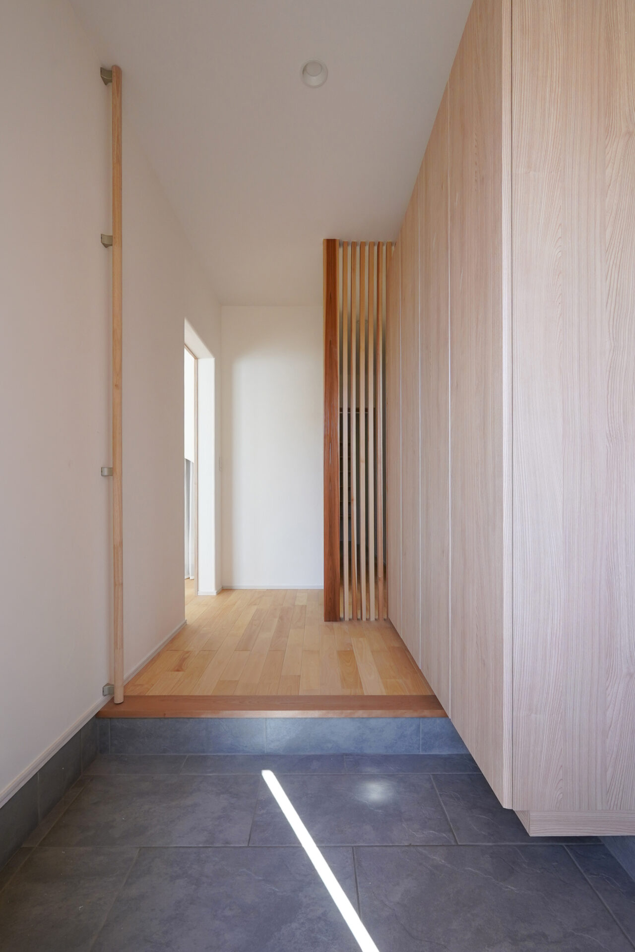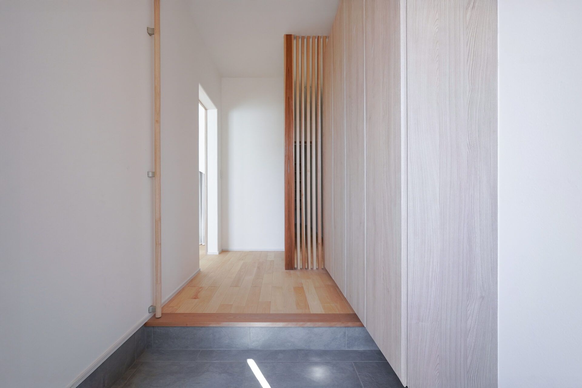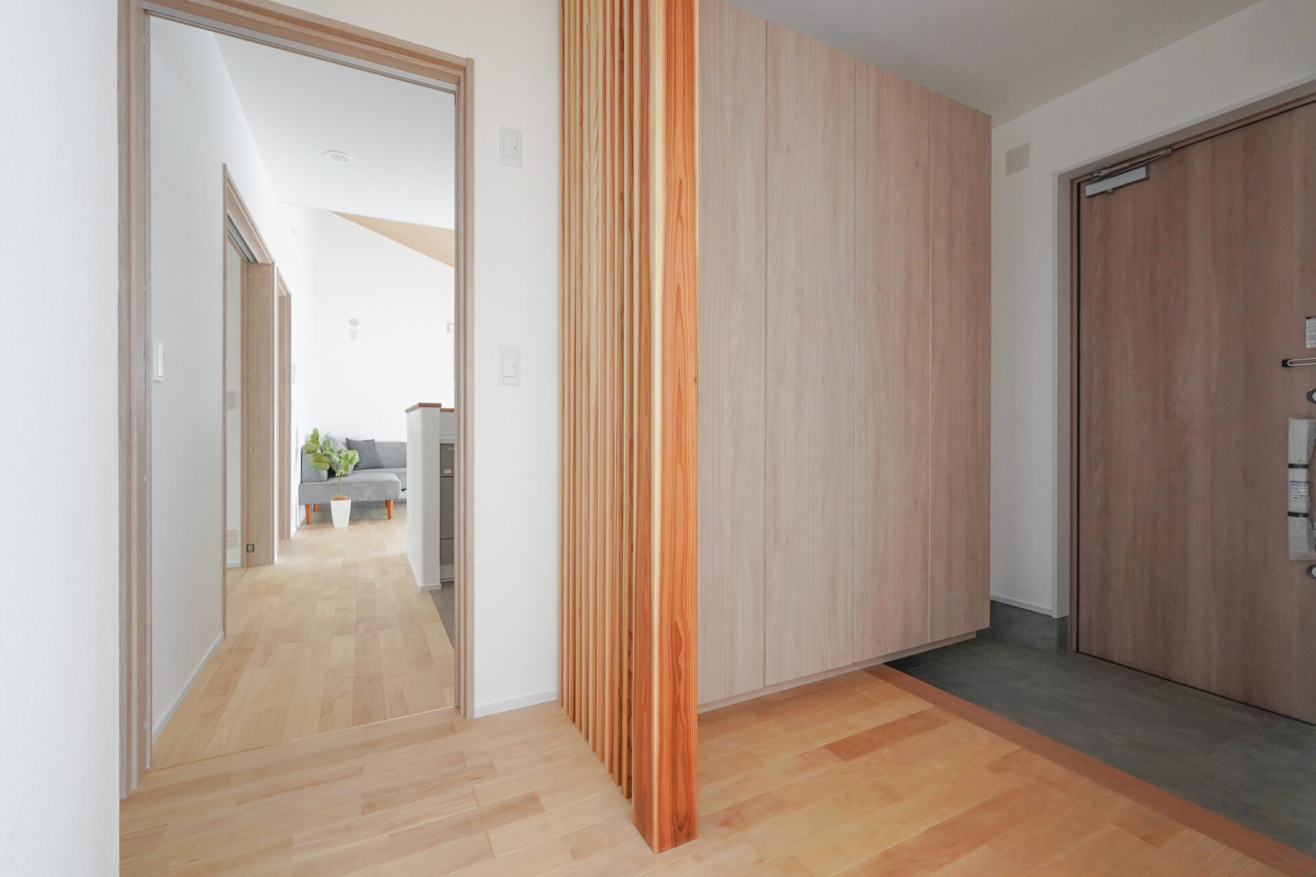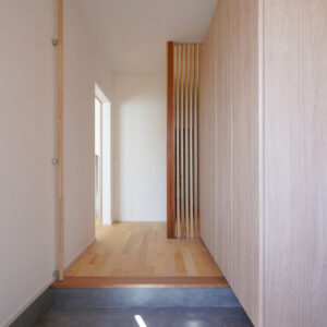 約5帖のゆとりある玄関ホールには、両世帯の靴をすっきりと収められる壁面収納を設置。右手に親世帯、左手に子世帯へとつながる動線を設け、正面奥のプライベート空間は格子によって視線をやわらかく遮っています。