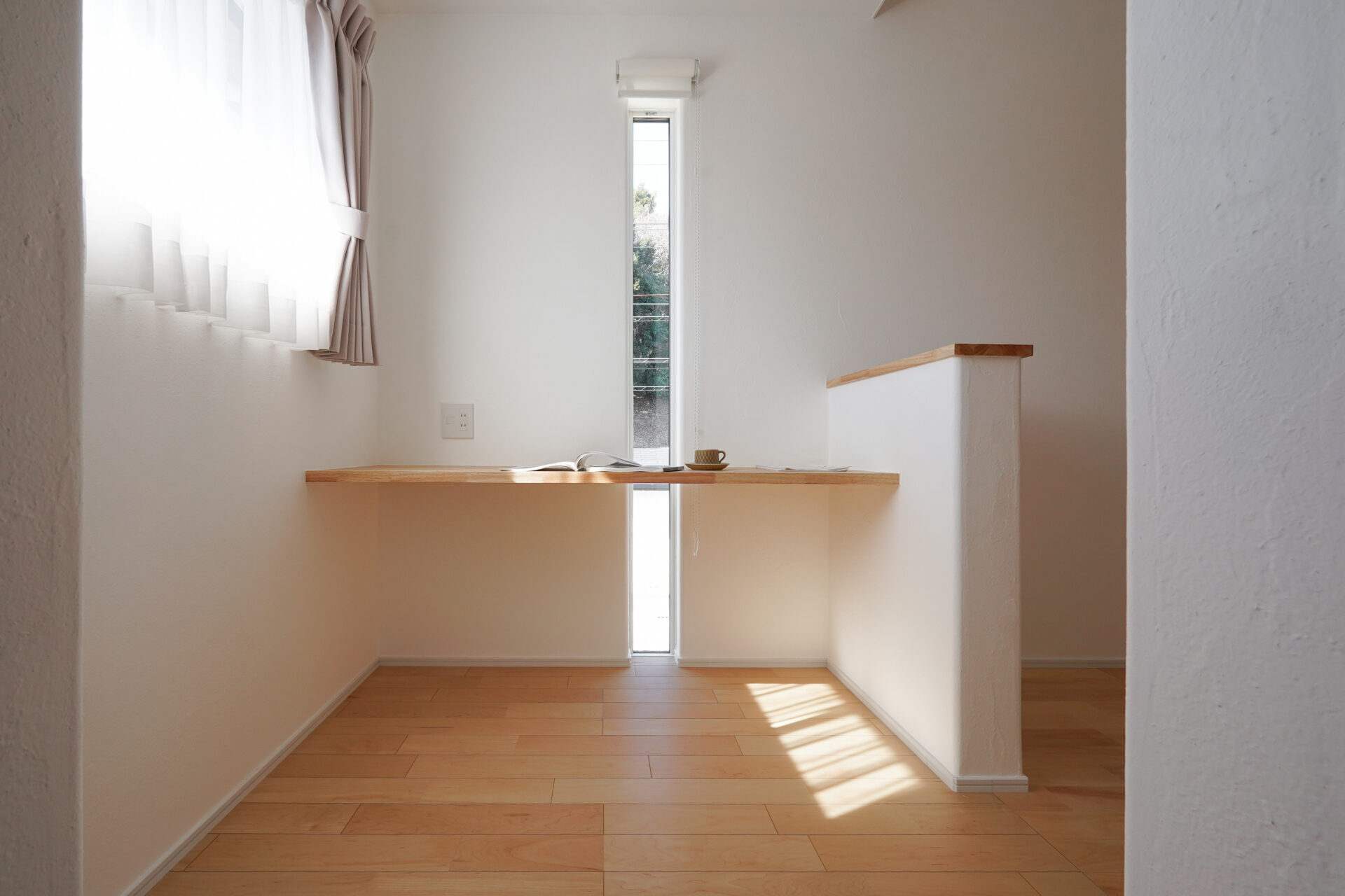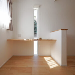 約6帖の主寝室には、造作カウンターを備えたワークスペースとウォークインクローゼットを配置。衣類や身の回りのものをすっきりと収める収納力を備えつつ、書斎や趣味の場としても活用できる多機能空間です。
