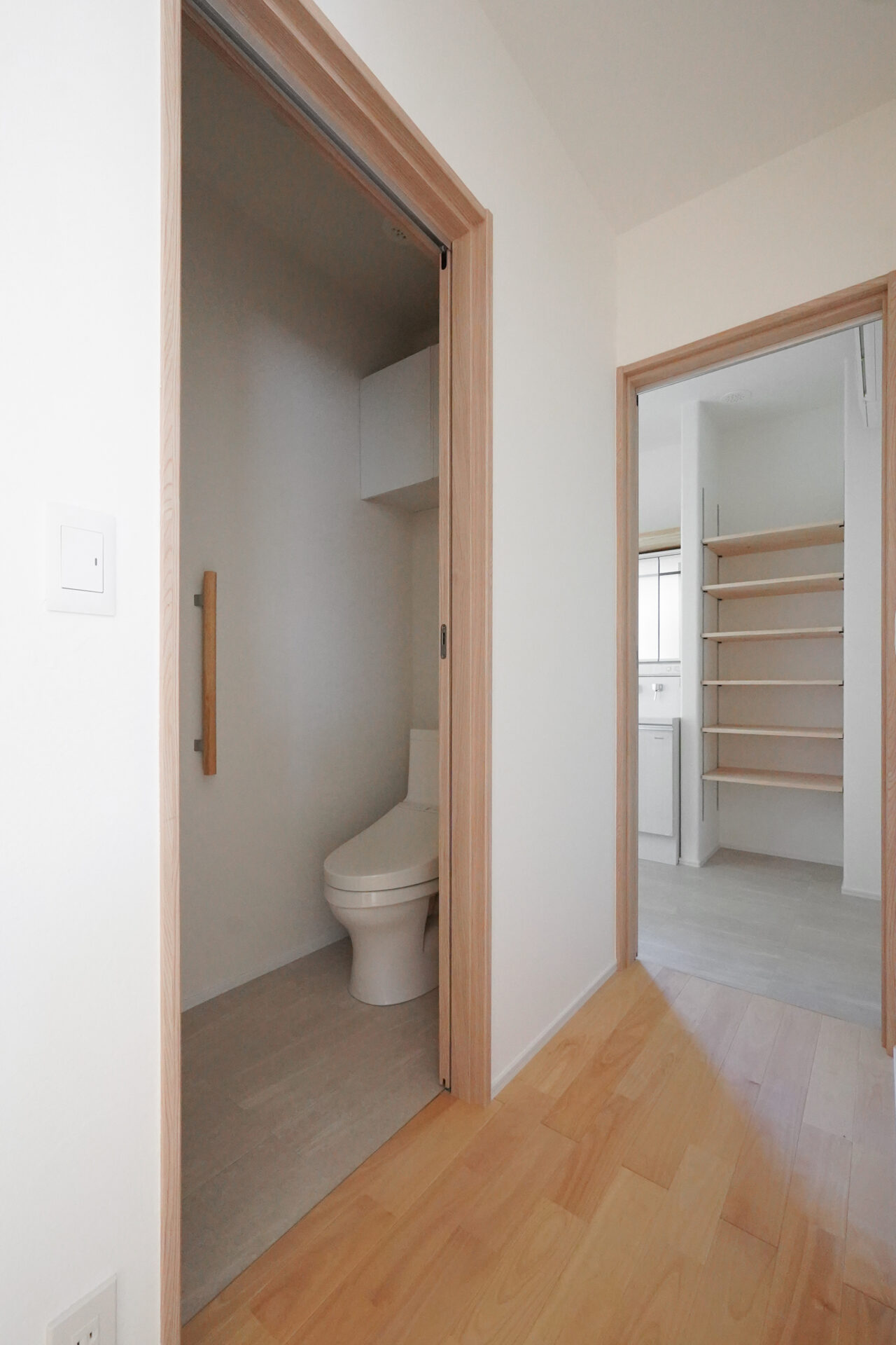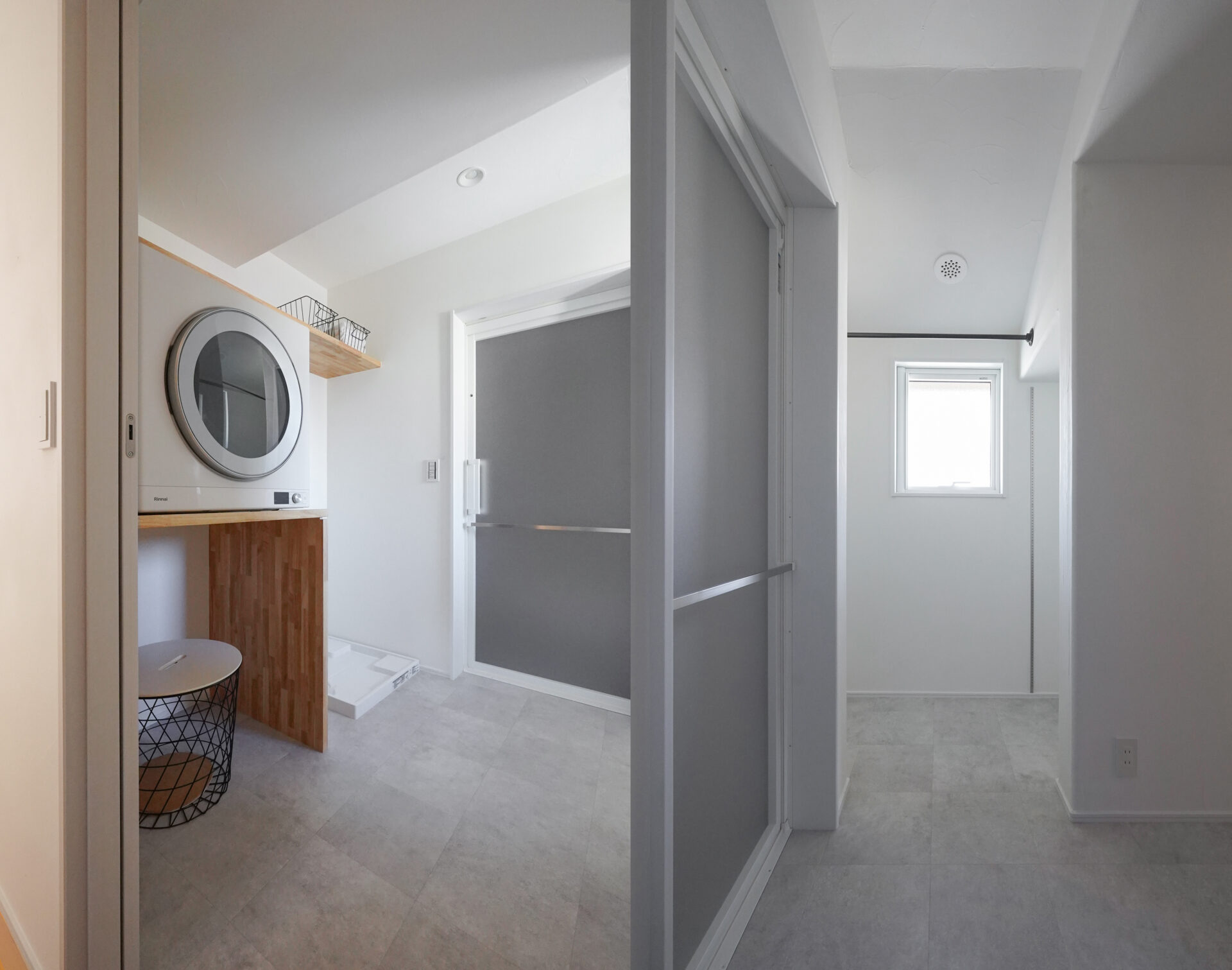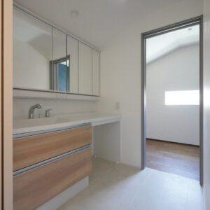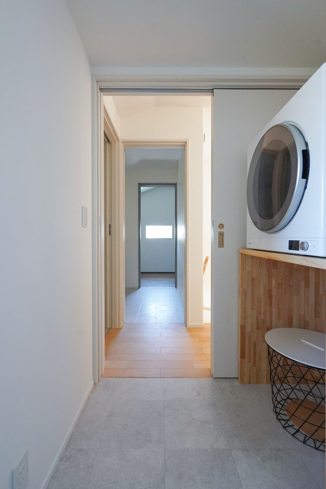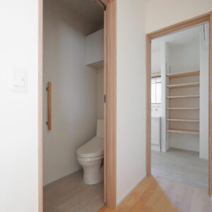 階段を上がった先の2階に集約した、約9帖の水回り空間。洗濯脱衣室からトイレ、洗面室、納戸までがスムーズにつながることで、家事のしやすさとゆとりある暮らしを支えます。