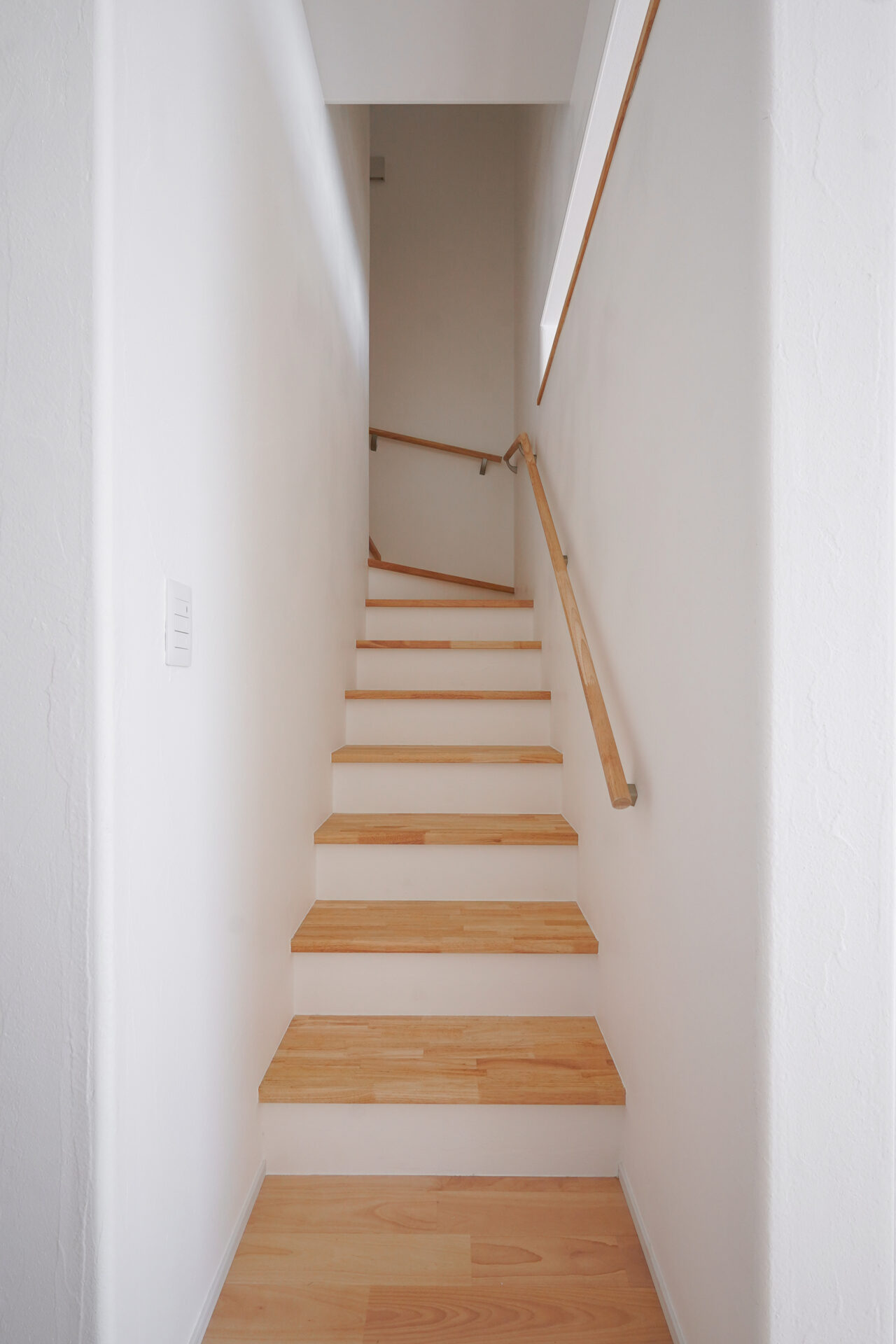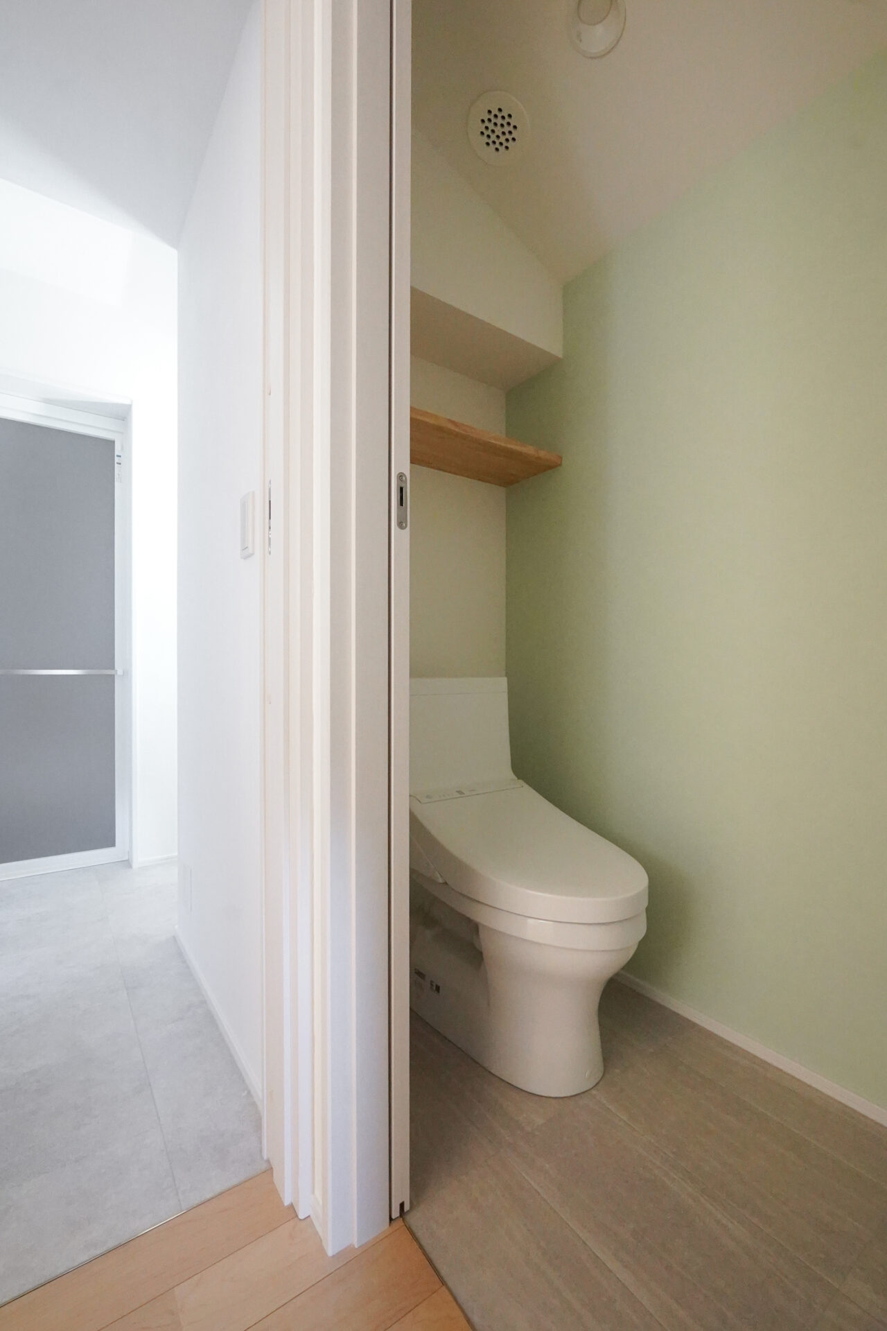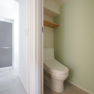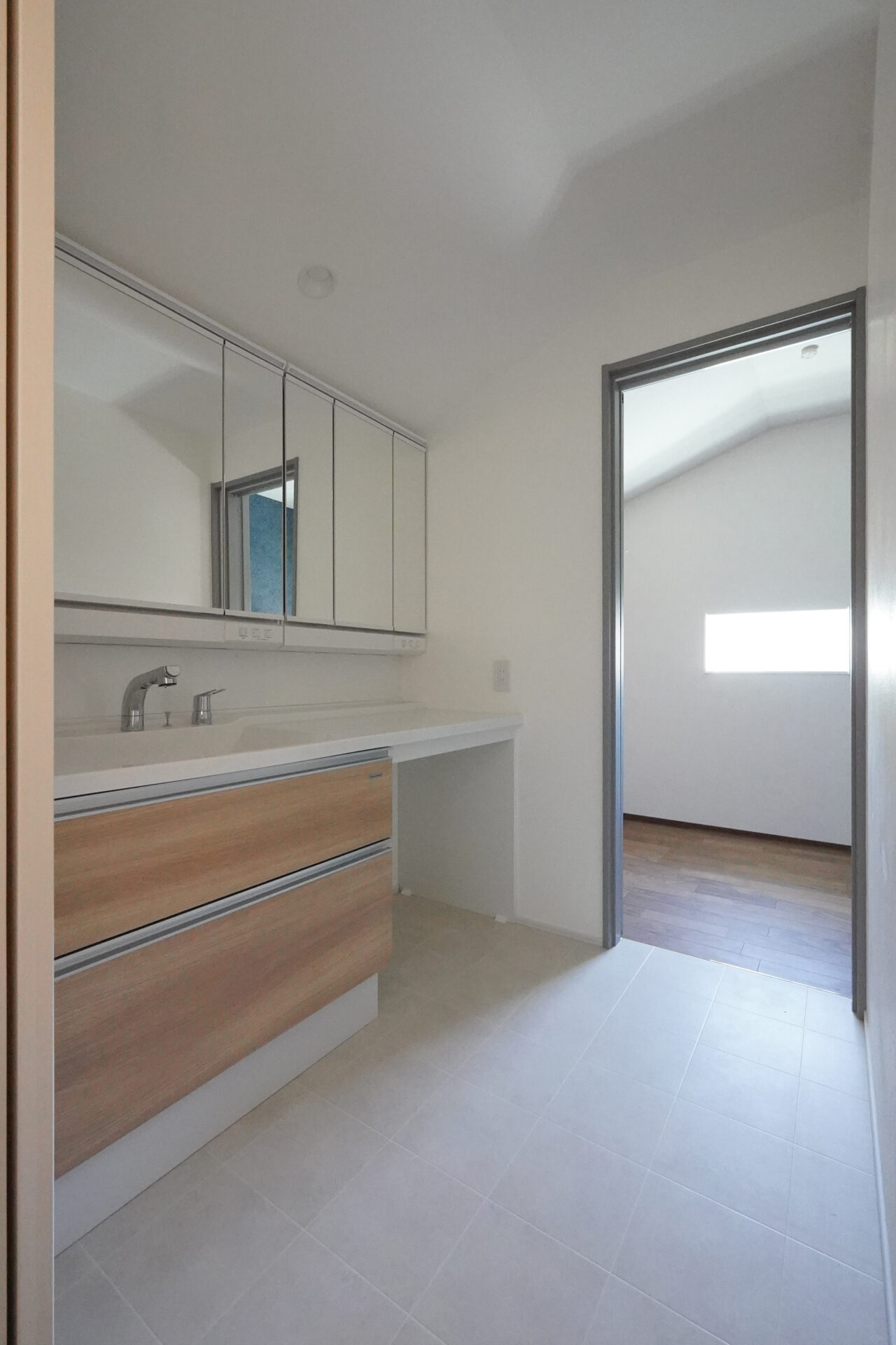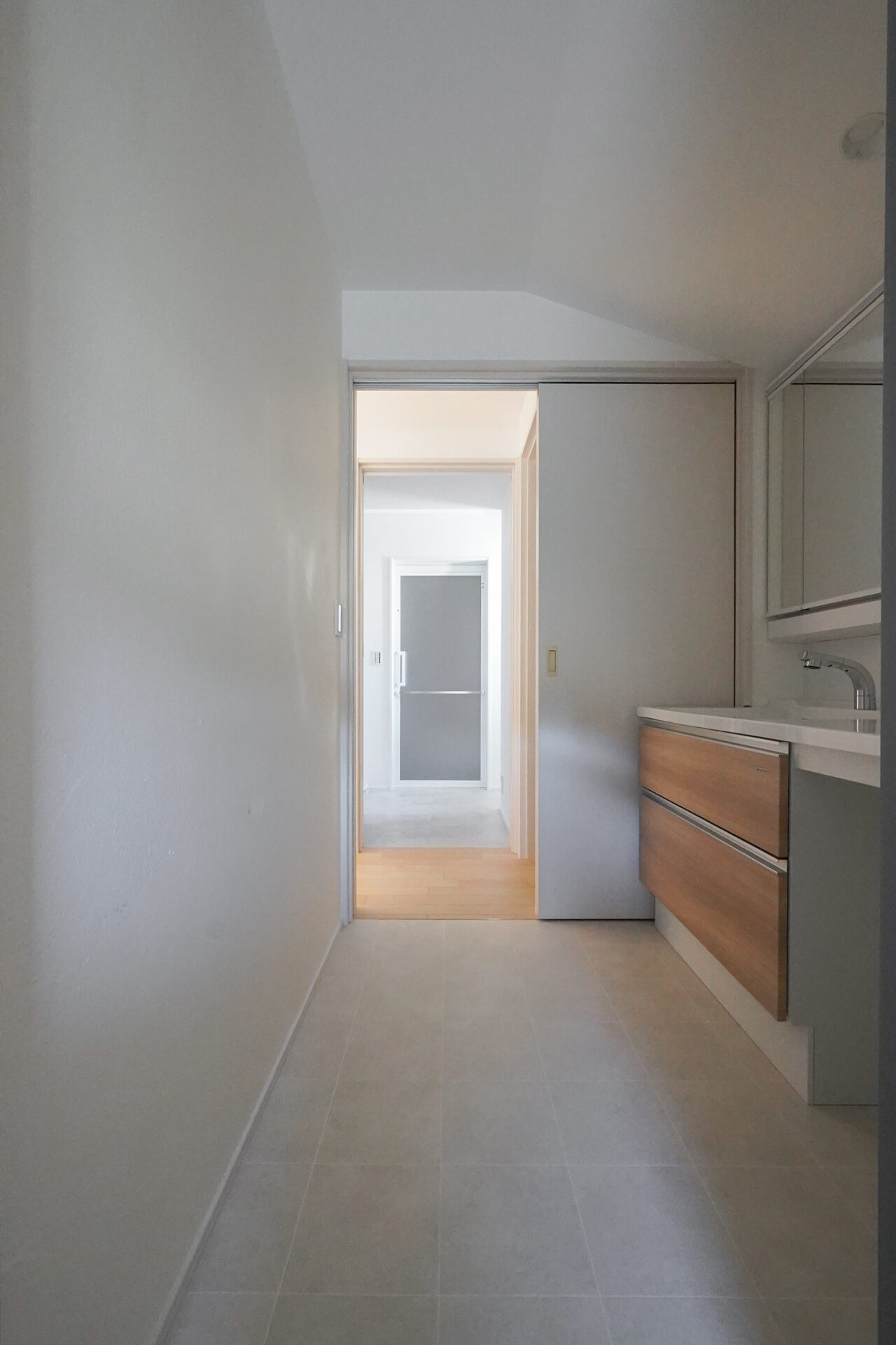 階段を上がった先の2階に集約した、約9帖の水回り空間。洗濯脱衣室からトイレ、洗面室、納戸までがスムーズにつながることで、家事のしやすさとゆとりある暮らしを支えます。