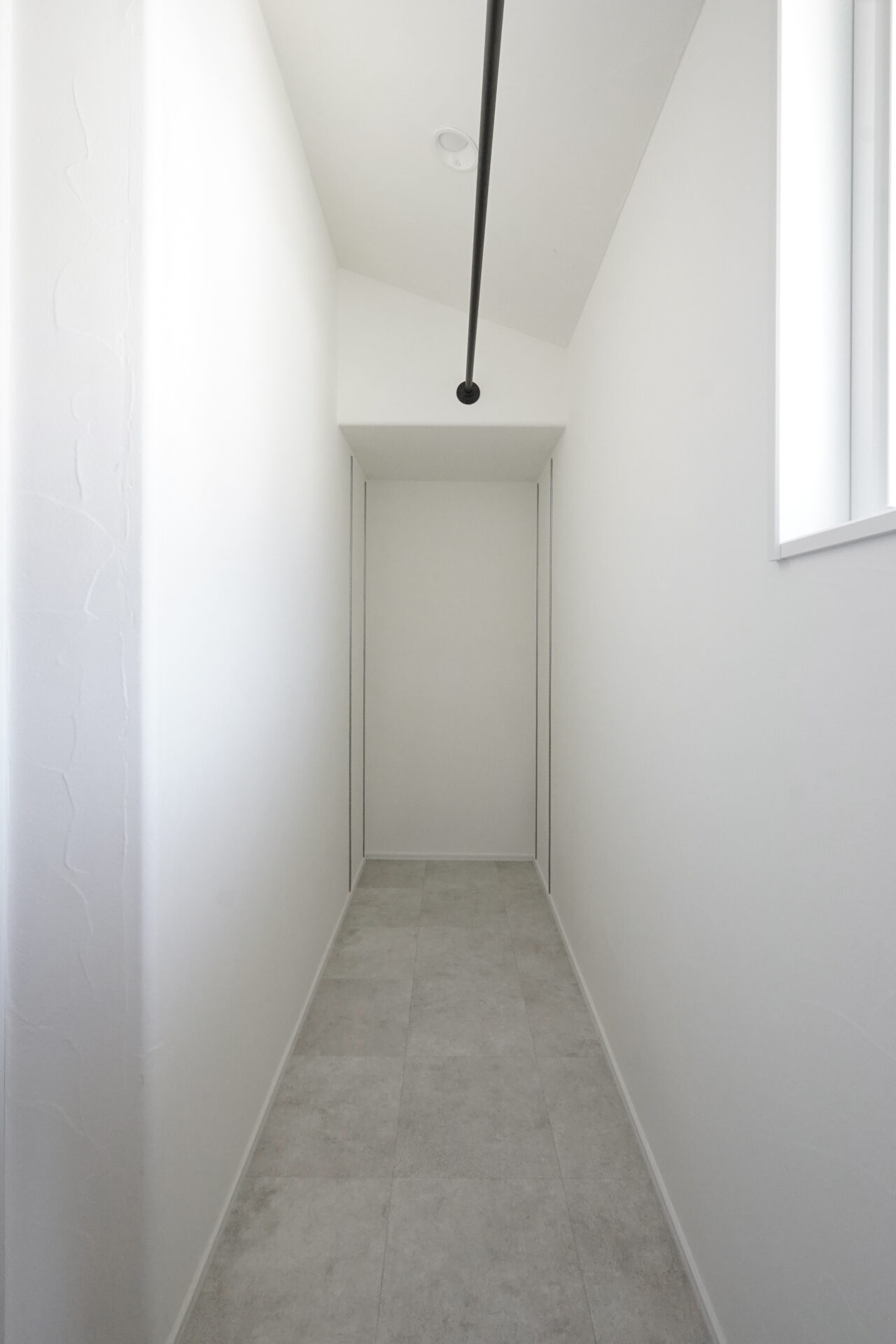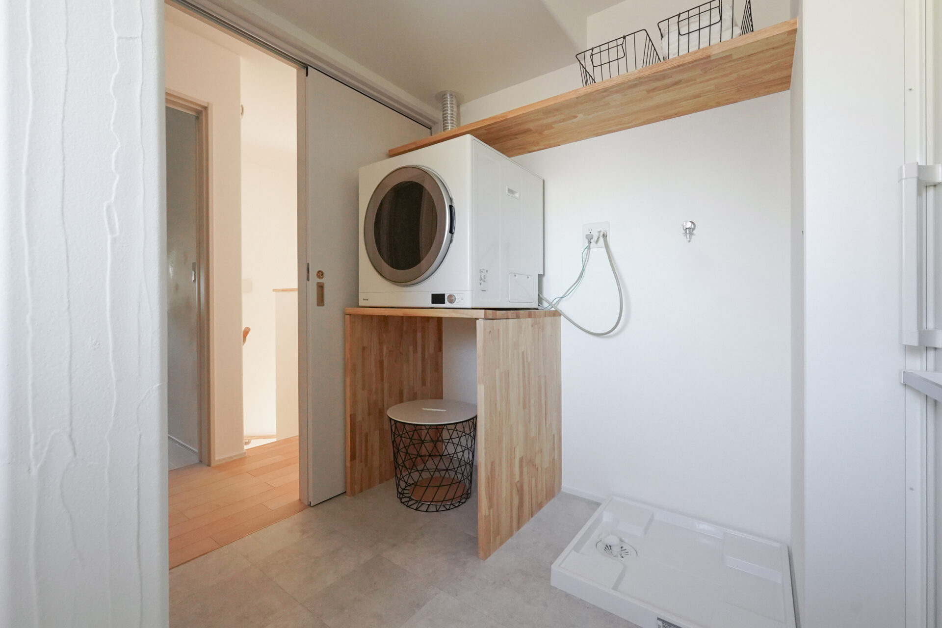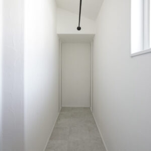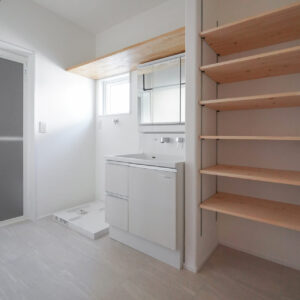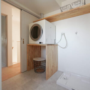 ガス衣類乾燥機「乾太くん」を備えた洗濯脱衣室には、約2帖の室内干し専用スペースを設けています。壁や天井には調湿性に優れた珪藻土の塗り壁を採用し、空気環境にも配慮した機能性の高い空間です。