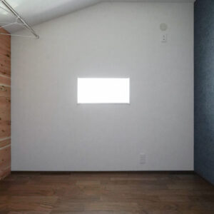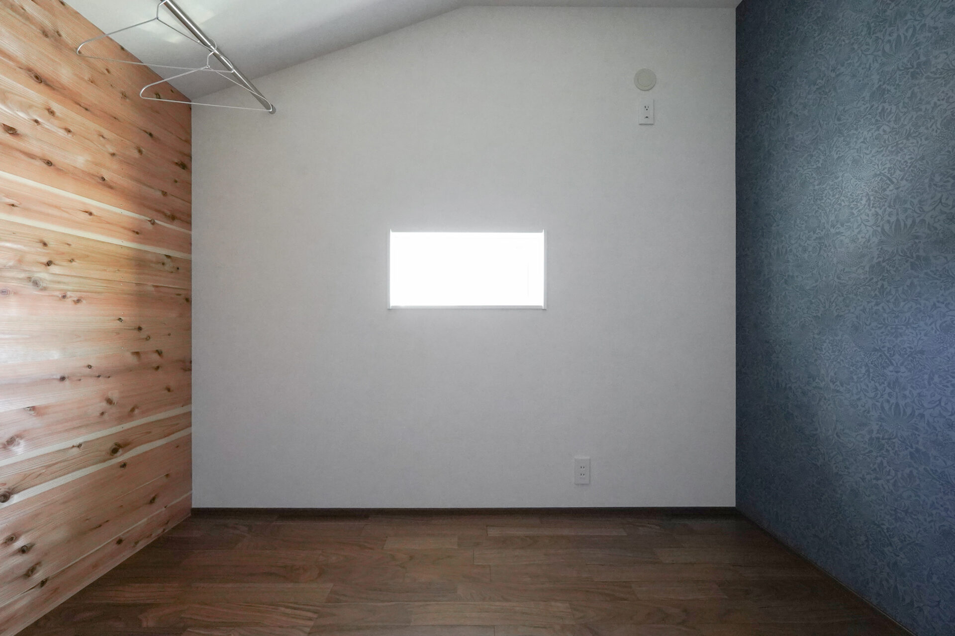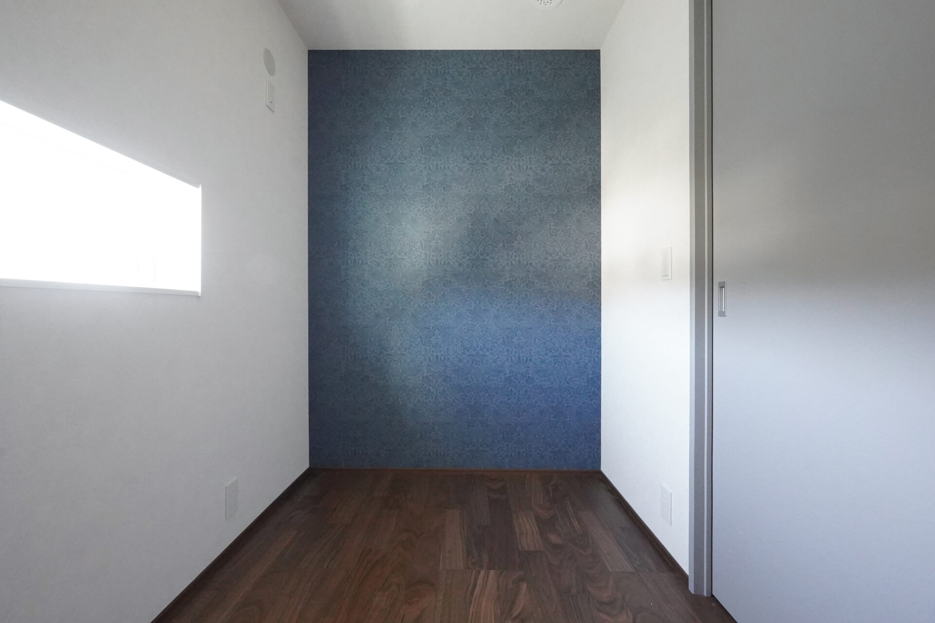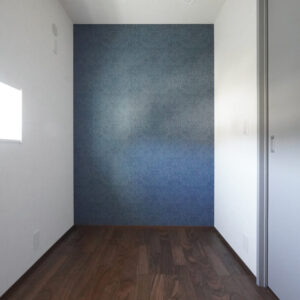 落ち着いた色合いでまとめた約3帖の納戸は、床にウォルナットのフローリング、壁にダークブルーのアクセントクロスを採用し、上質な空間に仕上げました。