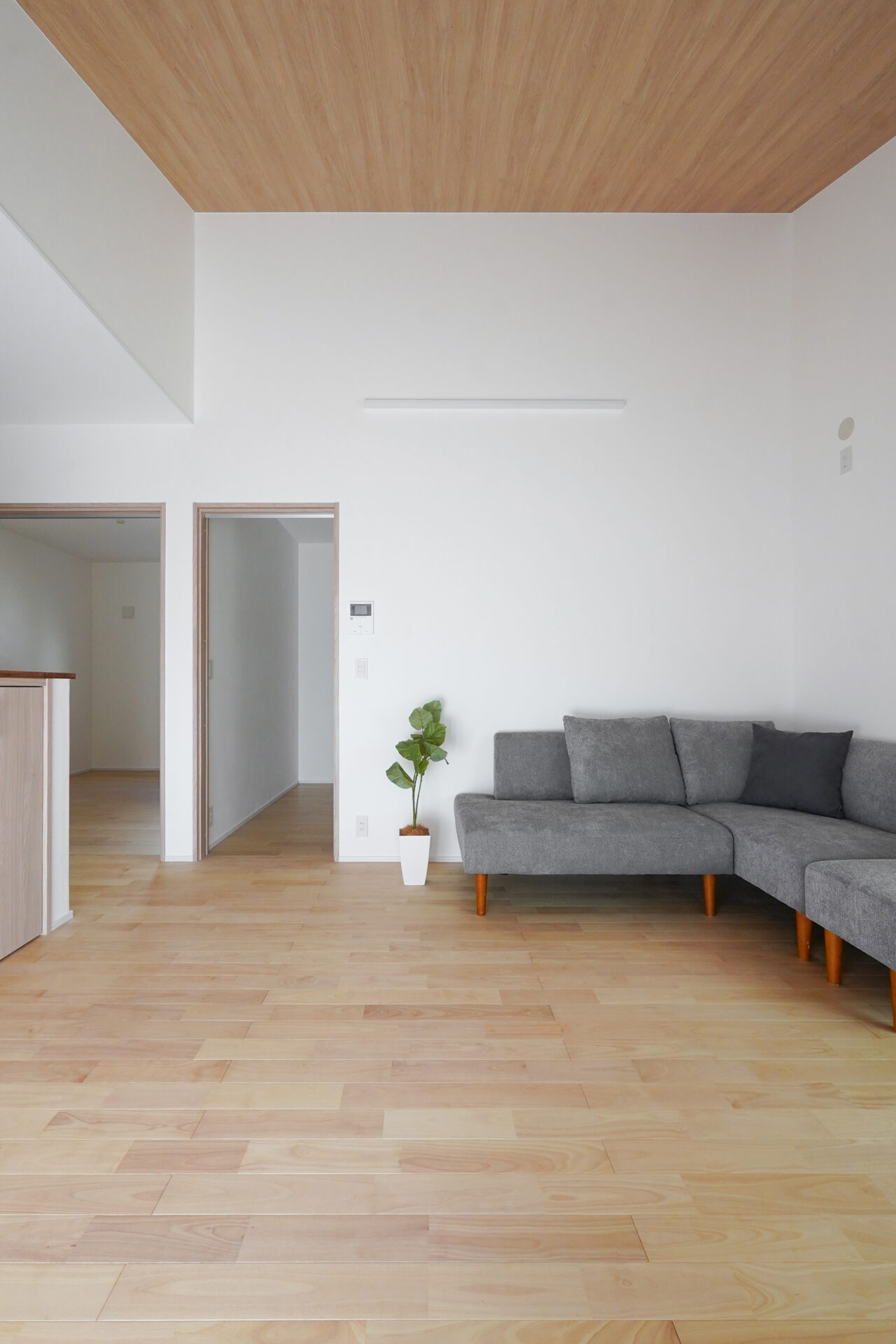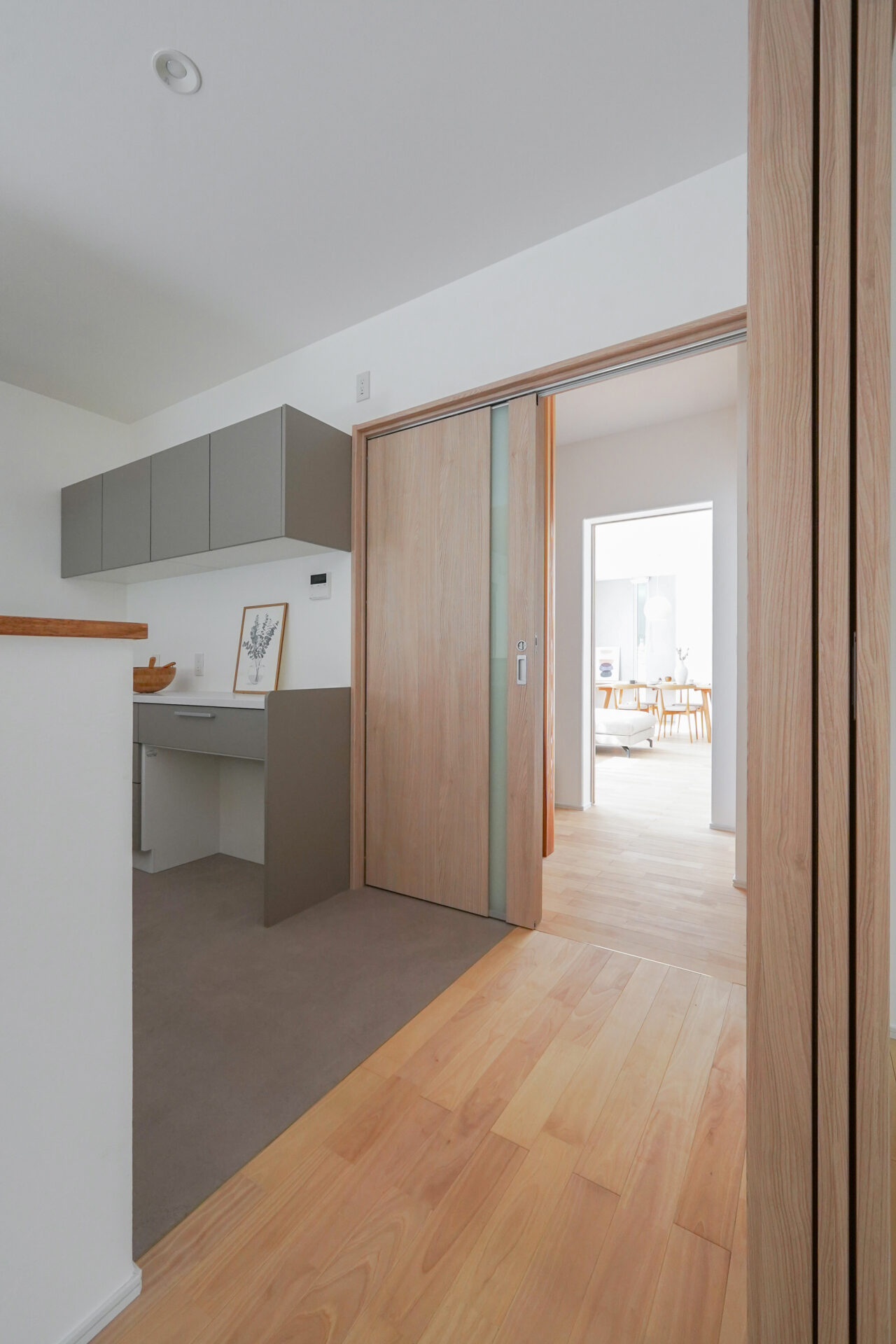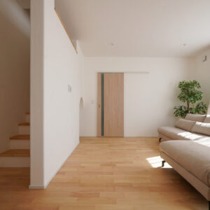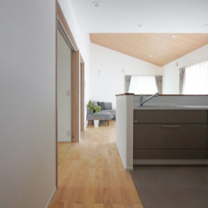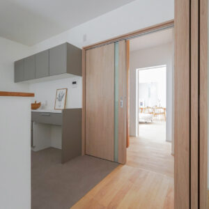 1階の子世帯リビングの先には玄関ホール、その先には親世帯の住空間が広がります。それぞれの暮らしを尊重しながらも、互いの気配をほどよく感じられる距離感を丁寧に設計しています。
