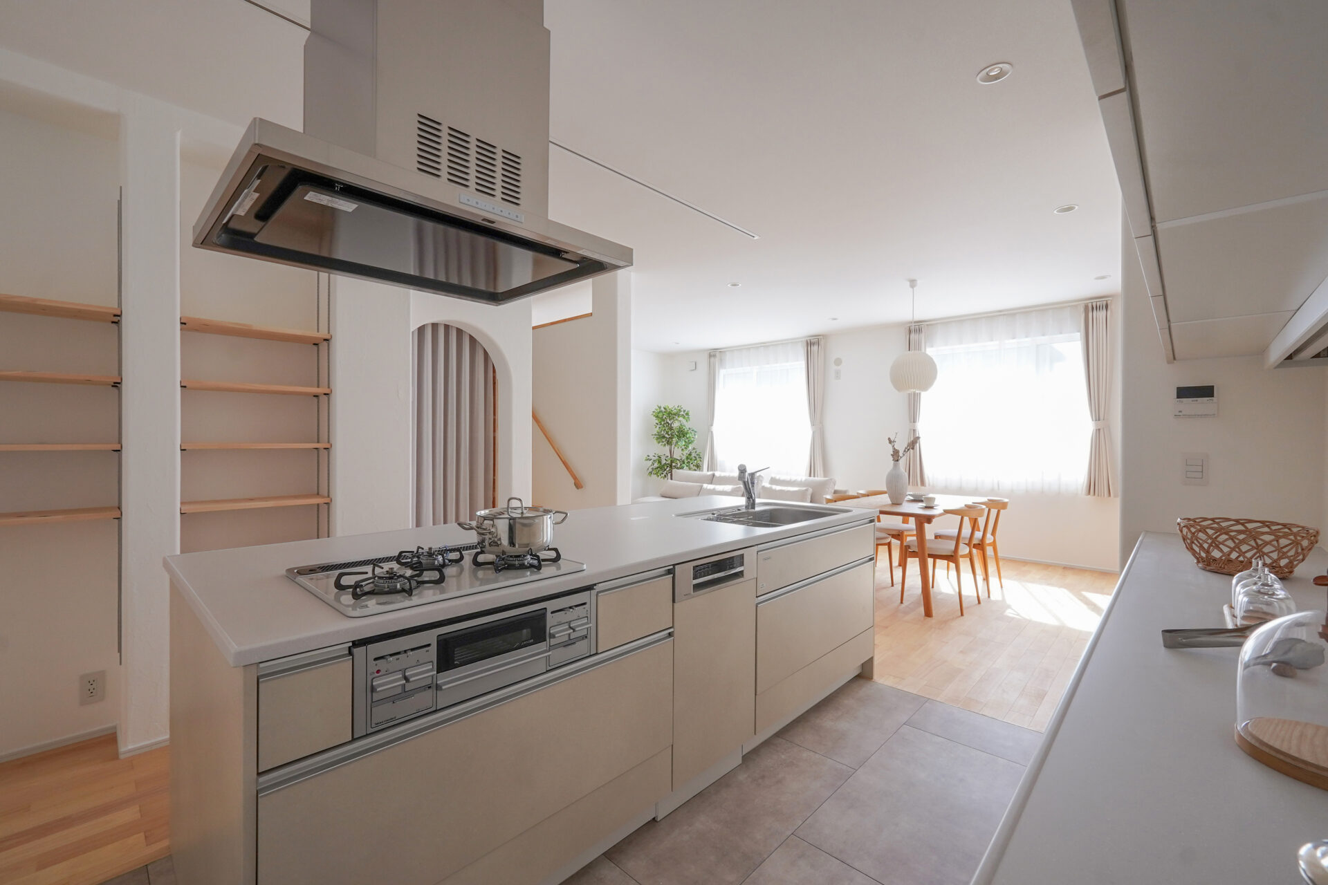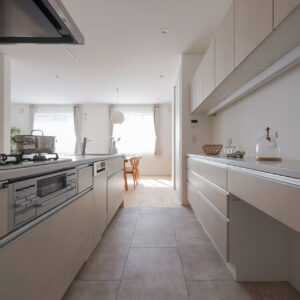 回遊動線を取り入れた約8帖のキッチンは、アイランドキッチンを中心に、ウォークスルークローゼットや可動棚、各種収納をバランスよく配置。家事動線を整えながら空間全体を見渡せるため、お子様を見守る安心感にもつながっています。