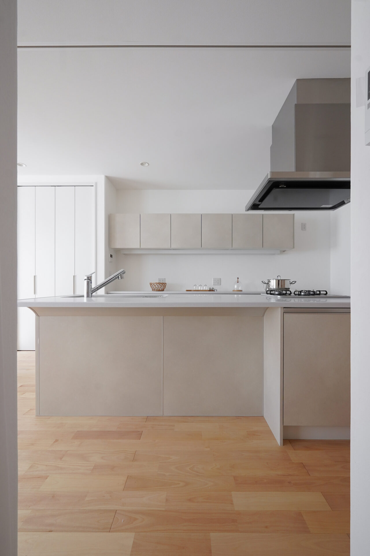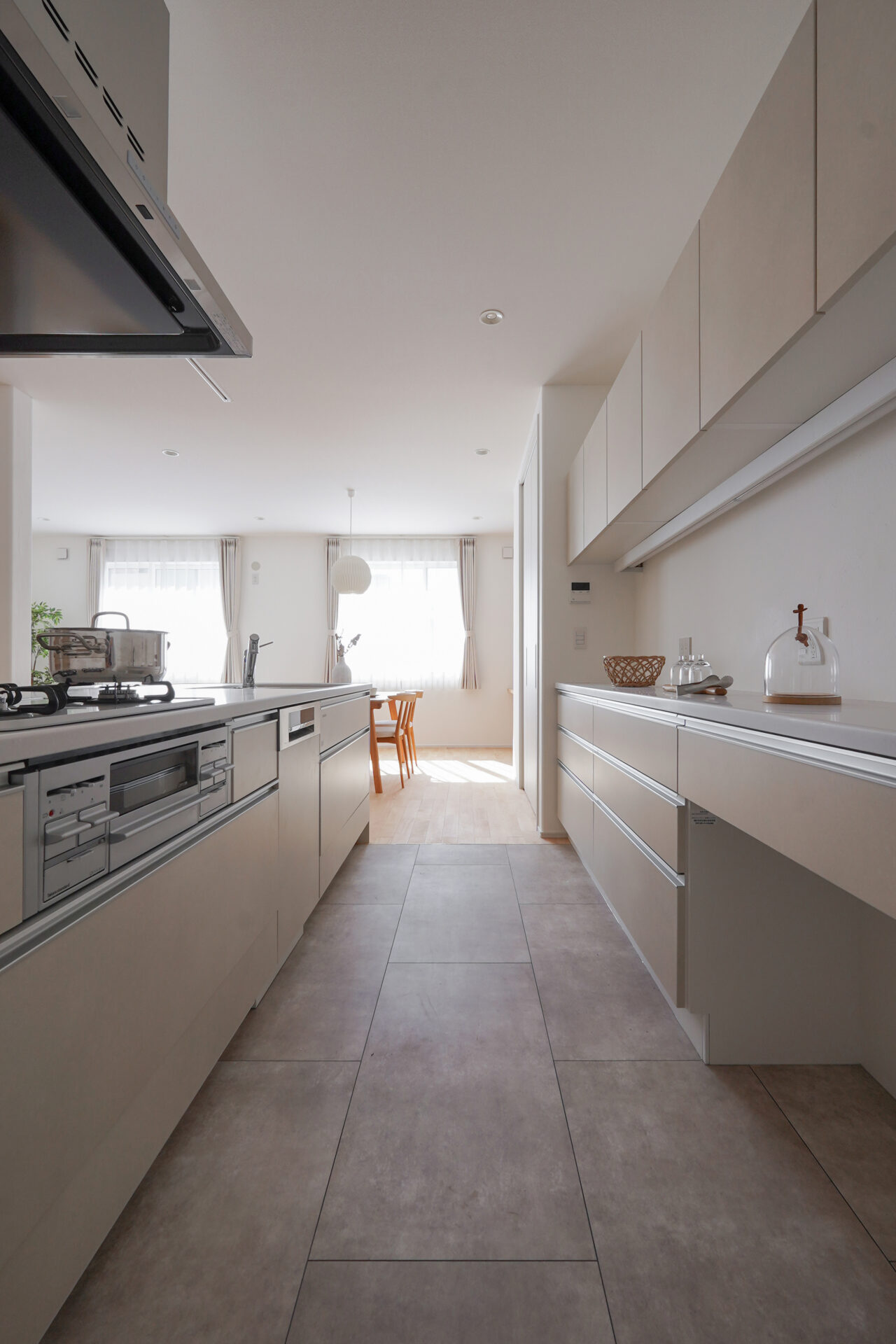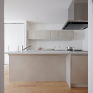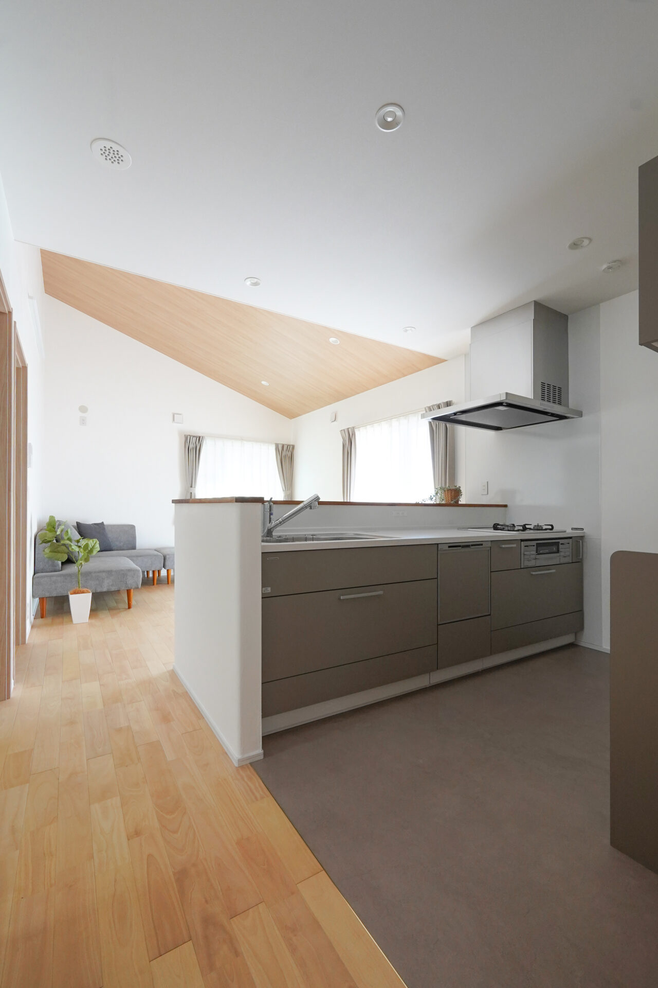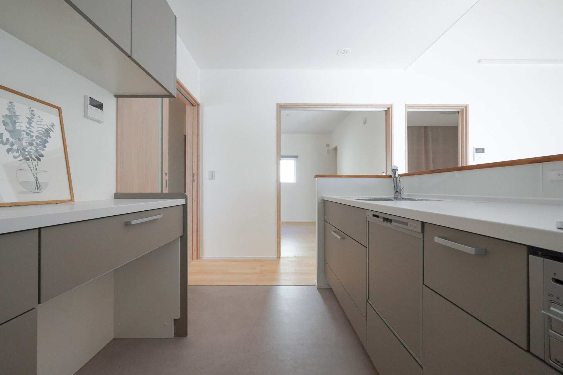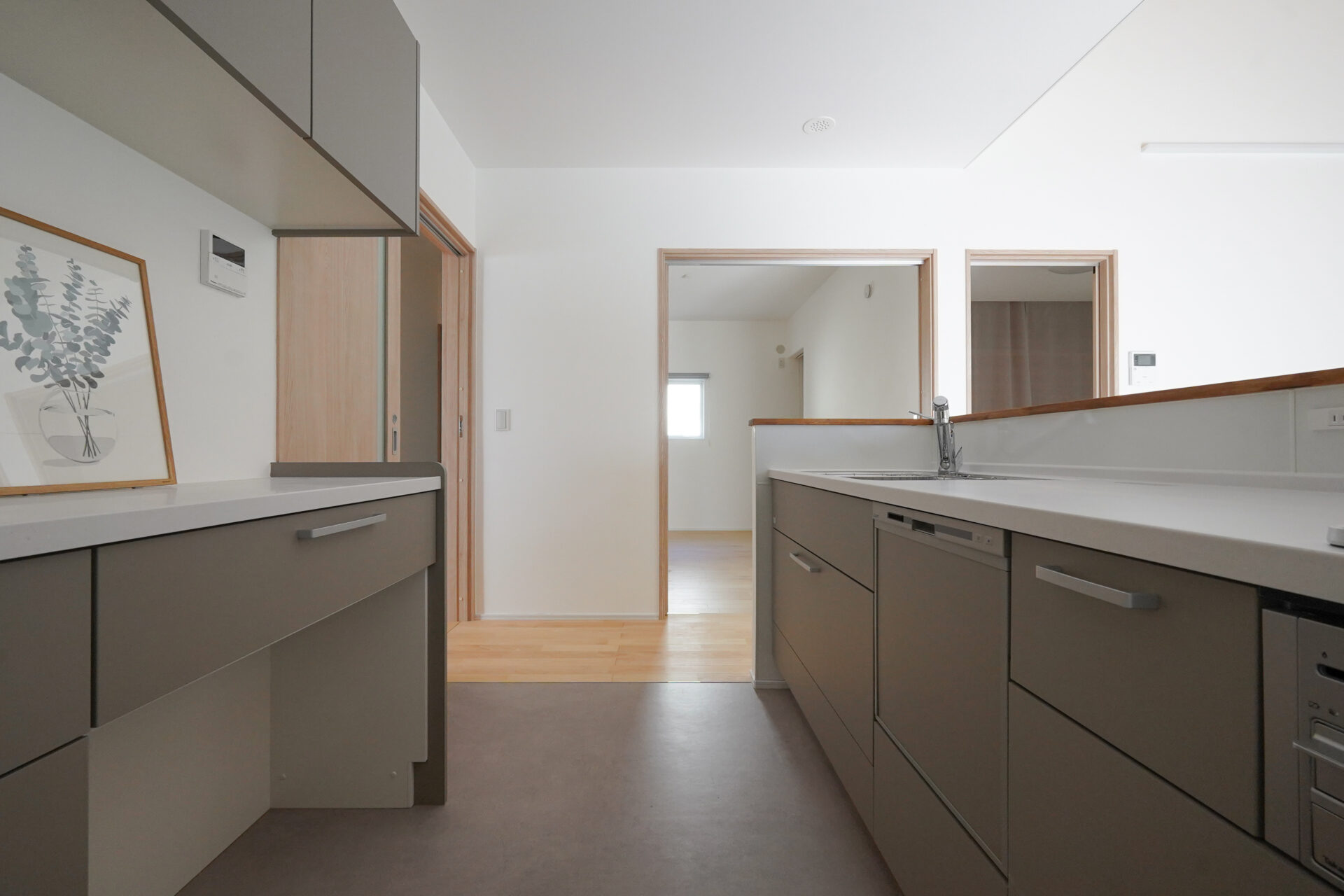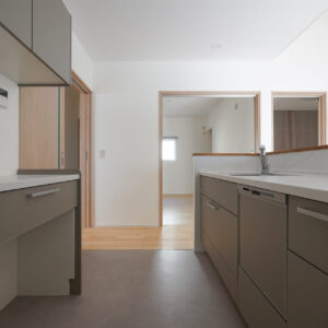 約5帖のゆとりある親世帯のキッチンスペース。グレーで揃えた扉と床のクッションフロアが空間に落ち着きをもたらし、腰壁を設けることで、シンクやコンロの手元をさりげなく隠しています。