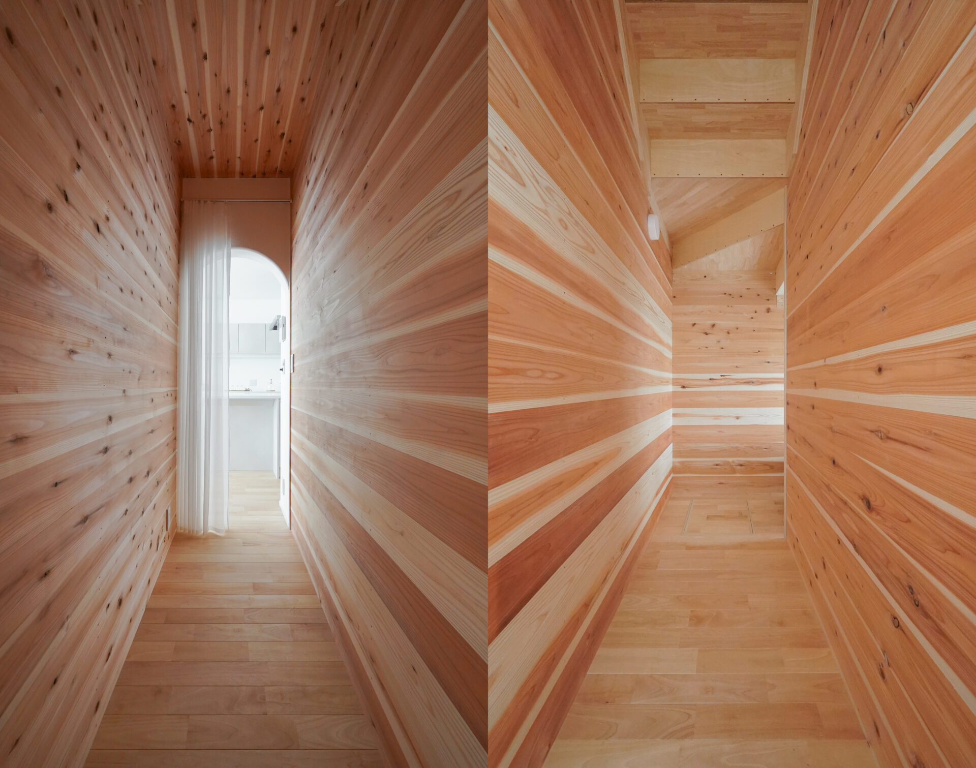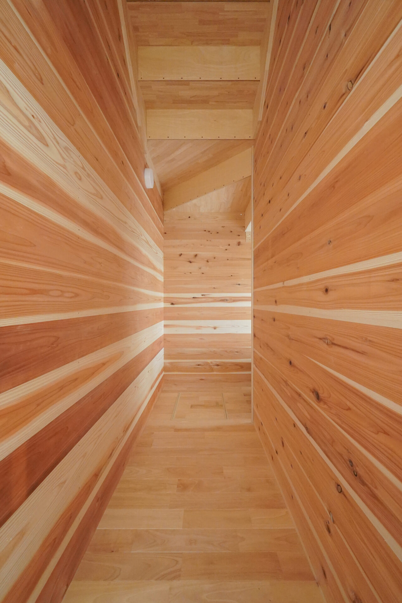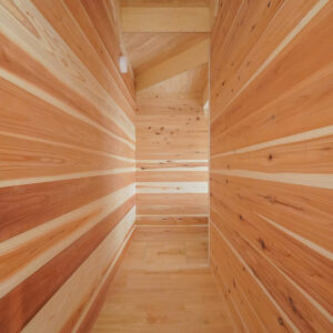 階段下の空間を有効活用して設けられた、杉板張りのウォークスルー収納。無垢の杉板が持つ調湿性や消臭効果により、快適さと機能性を兼ね備えたリビング収納として活躍いたします。
