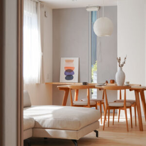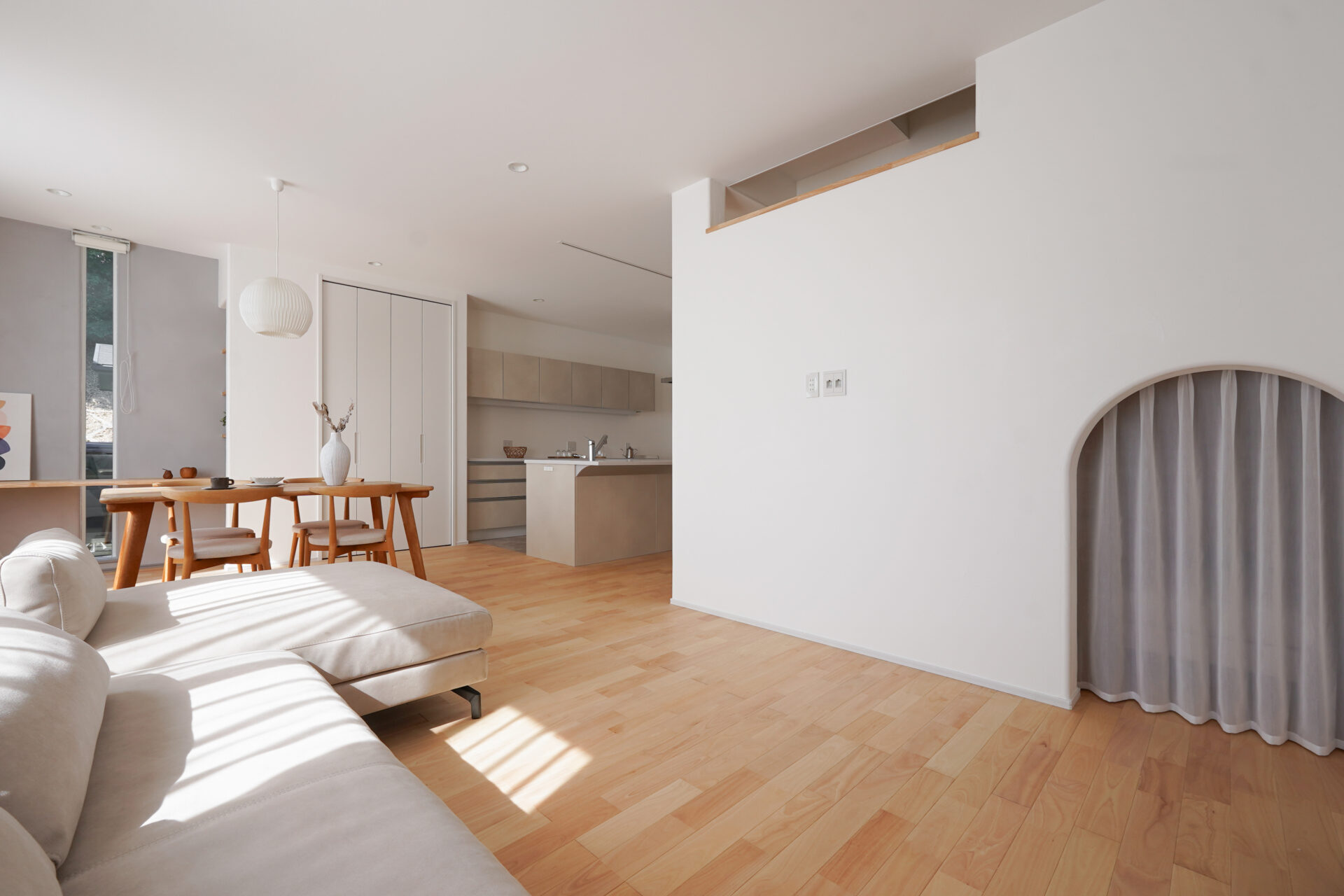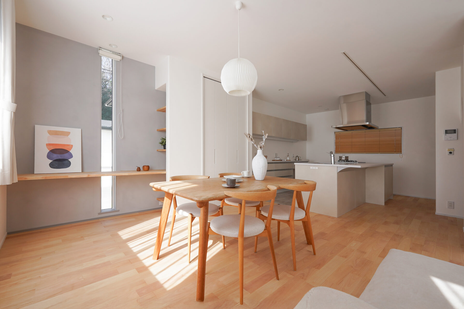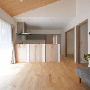 南面に設けた2つの腰窓からやわらかな光が差し込む、約21帖の広々とした子世帯のLDK。床にはサクラの無垢フローリング、天井と壁には調湿性に優れた漆喰の塗り壁を採用し、自然素材の心地よさと快適な空気環境を実現しています。