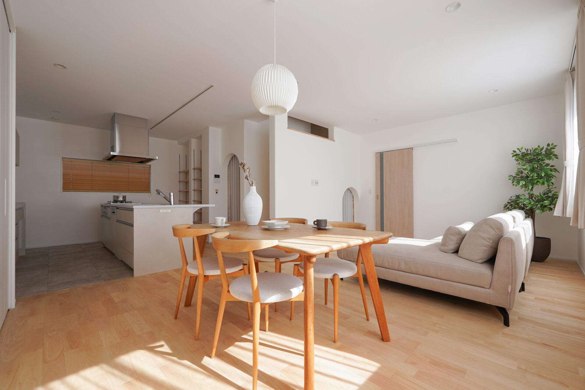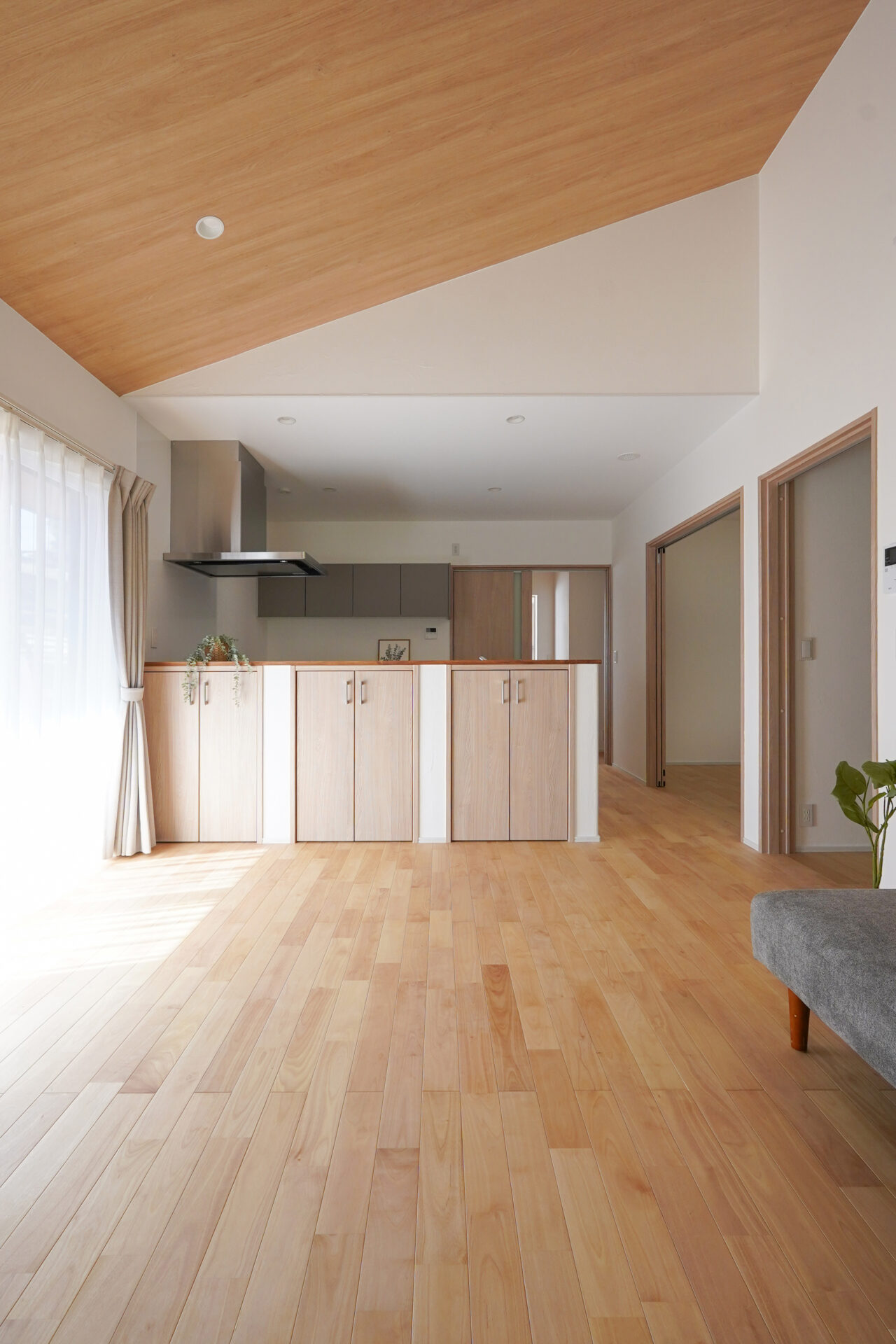 勾配天井が伸びやかな広がりを生む約14帖の親世帯のLDKは、子世帯と同様にサクラ無垢フローリングと漆喰の塗り壁を採用。南面に設けた大きな掃き出し窓からはたっぷりと光が差し込み、明るく開放的な空間を演出します。