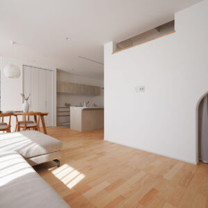 玄関の左手に広がる、親世帯の住空間。正面にLDK、左手に水回り空間を配置し、動線の流れを整えることで、小世帯とのつながりにも配慮しています。